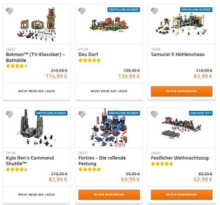 Einige Sets sind heute Morgen leider schon vergriffen bzw. schon nicht mehr auf Lager. In der vergangenen Jahren war es aber so, dass der Hersteller immer wieder einige Angebote „nachgelegt“ hat. Also einfach mal öfters in den LEGO Online-Shop schauen, es könnte sich lohnen. Nicht zu vergessen: Wir gehen davon aus, dass die reduzierten Sets aus dem Online-Shop ab morgen auch in den Brand Stores mit Rabatt zu haben sein werden.