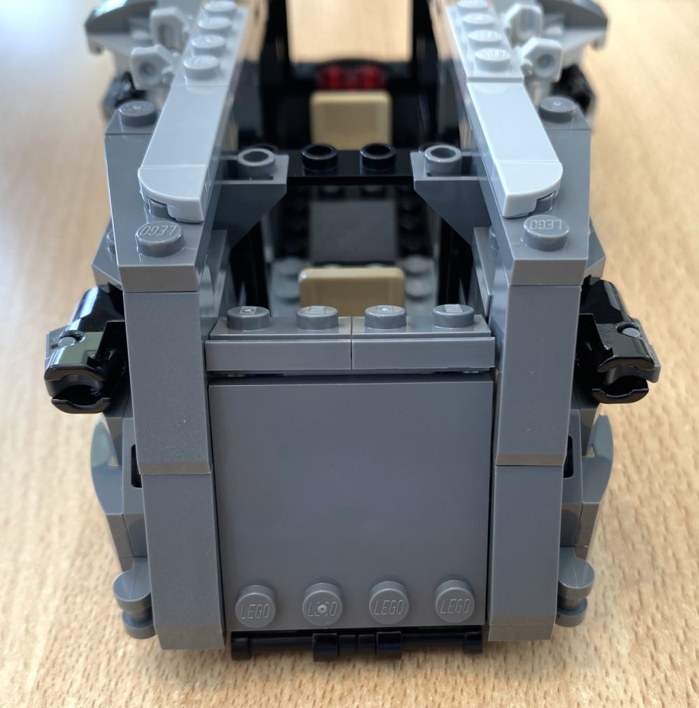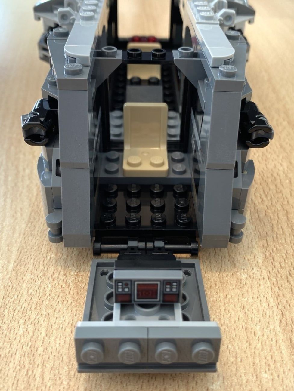 Mit der vierten Tüte ist das 75311 Imperial Armored Marauder Set komplett. Jetzt könnt ihr euch den Marauder mit all seinen Funktionen anschauen: Zugang zum Innenraum mit Platz für alle Figuren habt ihr durch die beiden Flügeltüren auf beiden Seiten direkt hinter dem Cockpit. Außerdem gibt es eine große Klappe im Dach. Fracht kann in zwei Abteilen hinter den Seitengeschützen verstaut werden, praktischerweise sind zwei bedruckte Container dabei. Diese kennt ihr schon von der 75290 Mos Eisley Cantina. Die Aurebesh Beschriftung liest sich auch hier „Cargo“.