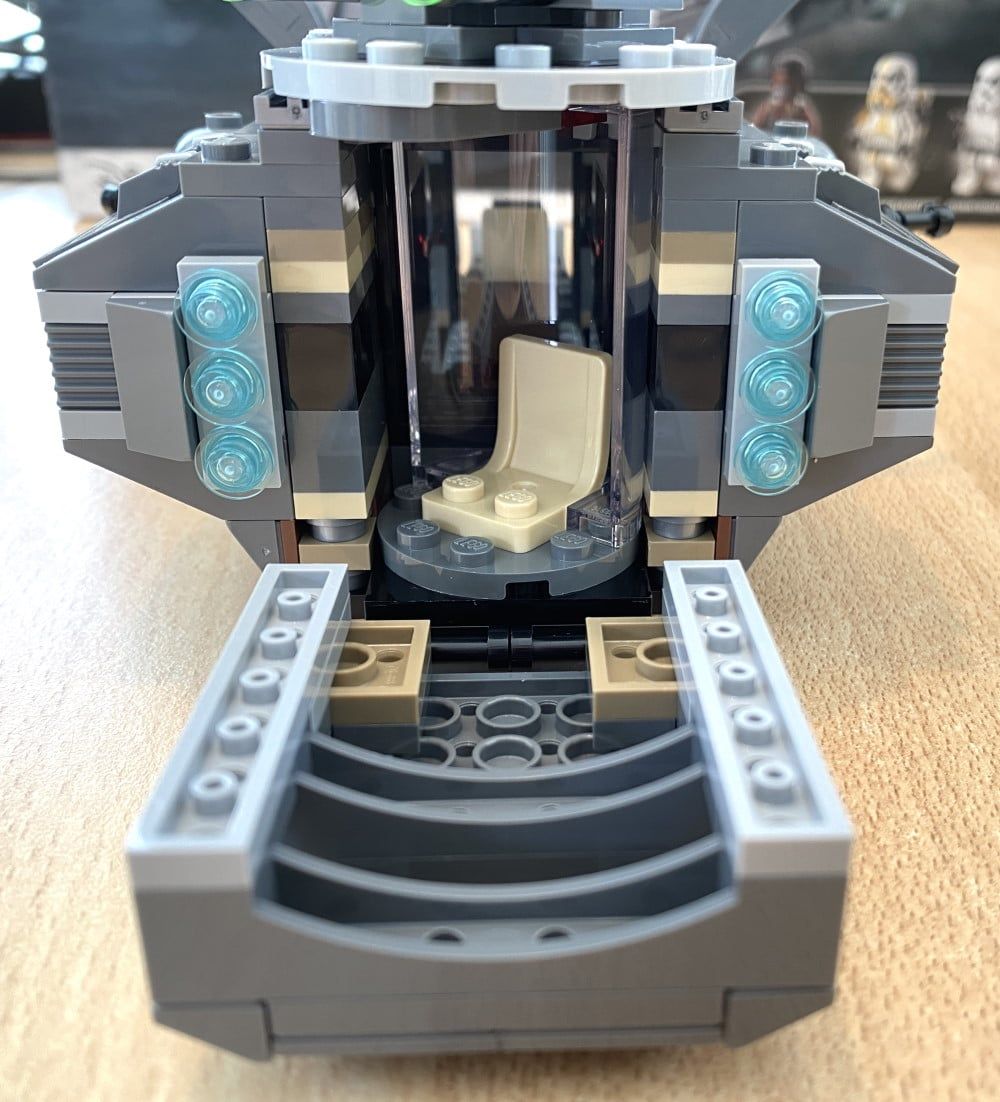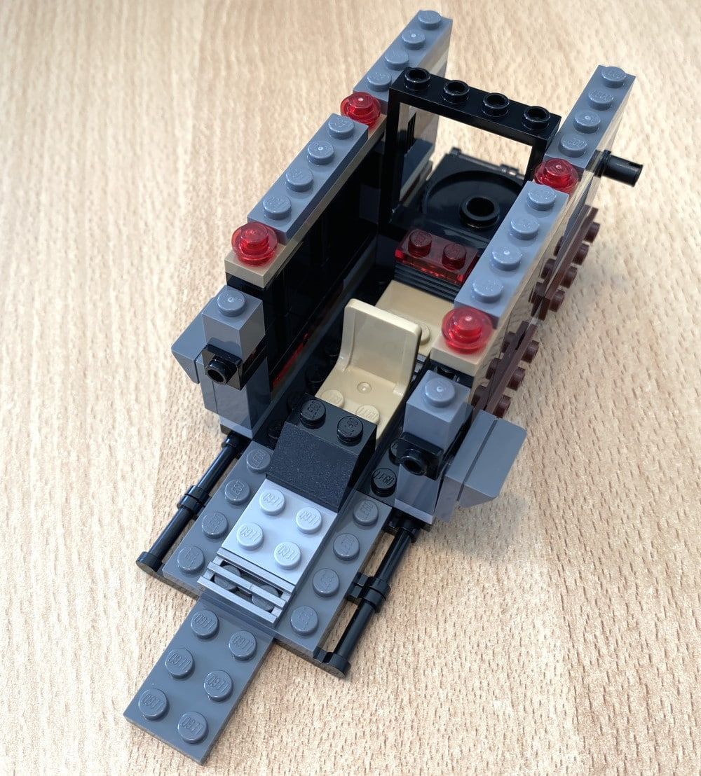 Die Sehschlitze sind wie beim Vorbild so angebracht, dass die sitzenden Figuren rausschauen können, das klappt hier auch hervorragend. Über den Boden „schwebt“ das Set übrigens auf elf 2 x 2 round tiles mit konvexer Oberfläche, die auf Teppich oder Parkett den leider noch nicht erfundenen Repulsor ersetzen.