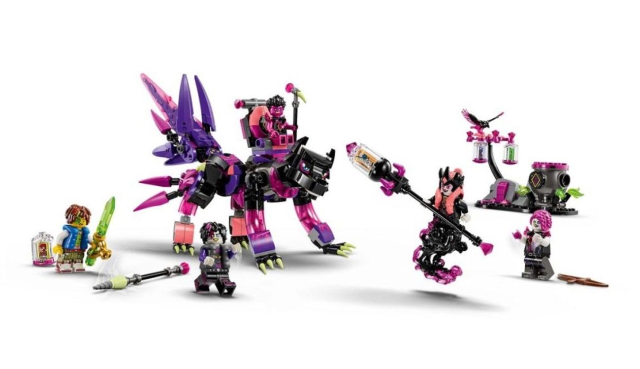 Die Albtraumkreaturen der Nimmerhexe werden für 44,99 Euro erhältlich sein und enthalten 457 Teile inklusive 5 Minifiguren. Dieses ist die günstigste Möglichkeit um an die Nimmerhexe und den neuen Mateo zu kommen. Außerdem gibt es auch noch 3 der bösen Versionen von Mateo, Izzie und Logan. Der kleine Rabe lässt sich in einen Mech mit Flügeln oder einen Wolf umbauen. Der Kessel mit dem Baum bleibt in beiden Bauwerken identisch und es sieht so aus, als ob es in diesem Set gleich 4 Sammelobjekte gibt. Das sind die kleinen Kuppeln mit den 1×2 Fliesen.