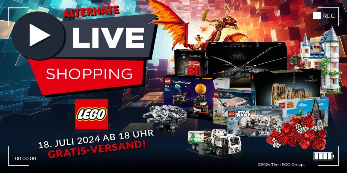 Keine große Shopping Woche ohne ein Alternate LEGO Live-Shopping Event, gewissermaßen als Konter auf den Amazon Prime Day veranstaltet Alternate wieder sein beliebtes LEGO Live-Shopping Event, genauer gesagt am Donnerstag, den 18. Juli 2024 um 18 Uhr. Es erwarten uns wieder mal zahlreiche sicherlich sehr gute LEGO Angeboten mit Rabatten von erfahrungsgemäß bis zu 45% auf die UVP, darunter auch einige Neuheiten.