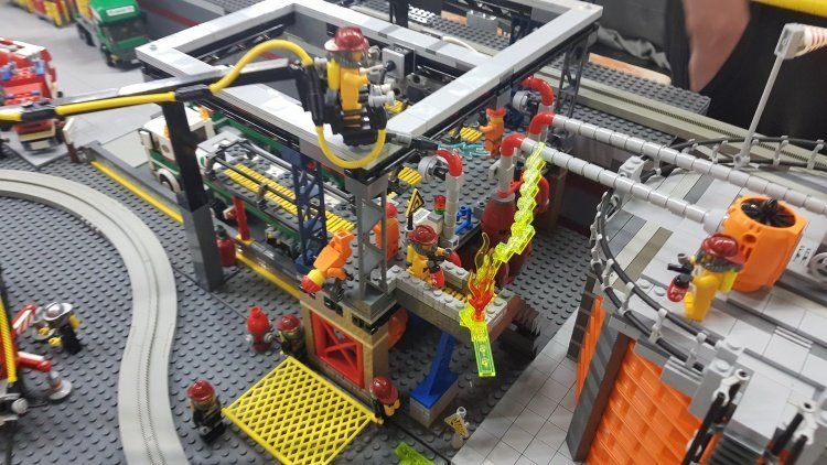 Der Aufbau war bereits in vollem Gange. Nach einem kurzen „Hallo“ an alle ging es direkt an den Aufbau. Ich selber war mit meiner Chemieanlage für die Monorail-Gemeinschaftsanlage (MoRaSt) vor Ort. Die beiden Mitstreiter hatten ihr Grundlayout bereits liegen, also keine Müdigkeit vortäuschen und loslegen. Am Abend war ich dann soweit, dass ich bis auf ein paar Feinheiten (Feuerwehreinsatz) soweit alles aufgebaut hatte.