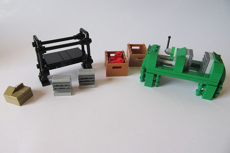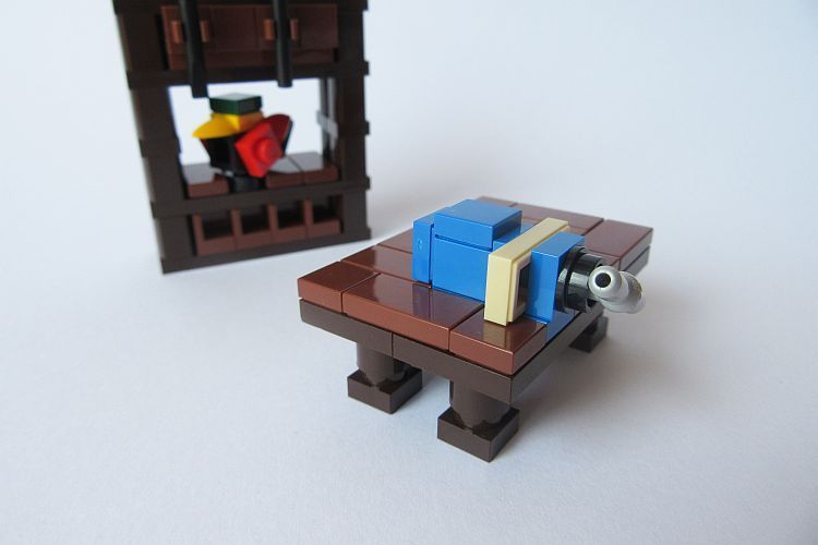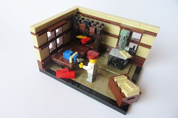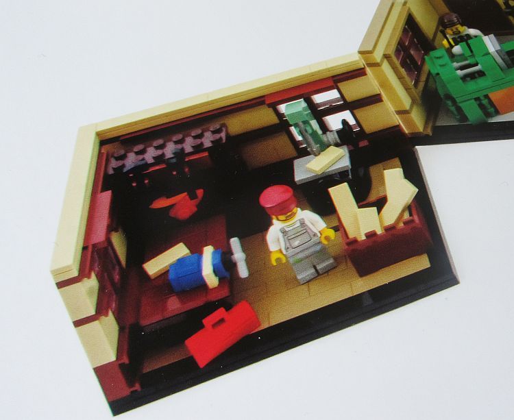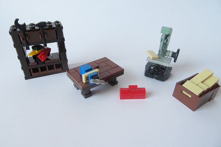 Wobei ich schon vorweg nehmen muss, dass dieses Gebäude mein Highlight dieses Sets ist. Die Liebe zum Detail und wie aus wenig Steinen, viel geschaffen wird, fasziniert mich immer wieder. Sei es die Fräse, der grandiose Schraubstock oder die legendäre Holzente – einfach klasse.