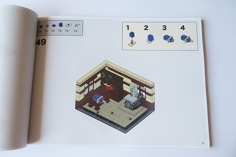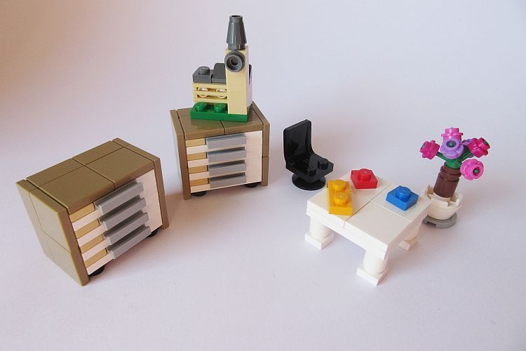 Zwei große Schränke mit Schubladen werden zusammengesteckt, in denen sich (im realen Vorbild) unzählige von verschiedenen Steinen befinden, mit denen immer wieder neu experimentiert werden kann. Eine Miniatur des LEGO Big Ben (10253) ist ebenso dabei, sowie ein Tisch, ein Stuhl und eine dekorative Blume – das Zimmer gehört eben einer Frau.