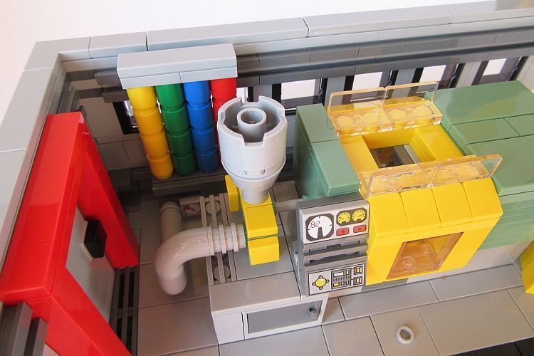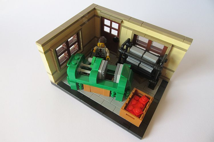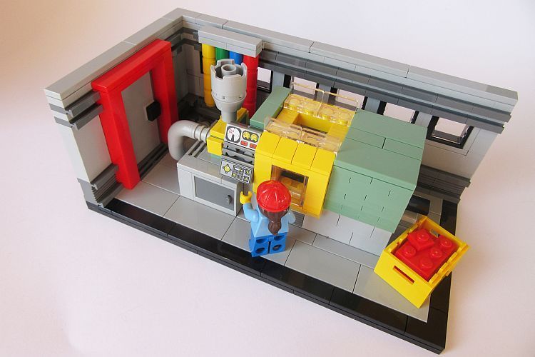 Zur Einrichtung gehören hierbei die alte Spritzgussmaschine zusammen mit Spritzgussformen, einem Regal und Kisten für die produzierten LEGO Steinchen. Diese Spritzgussmaschine gab es auch schon als LEGO Inside-Tour-Set (4000001) im Jahre 2011 zusammen mit einer modernen Maschine.