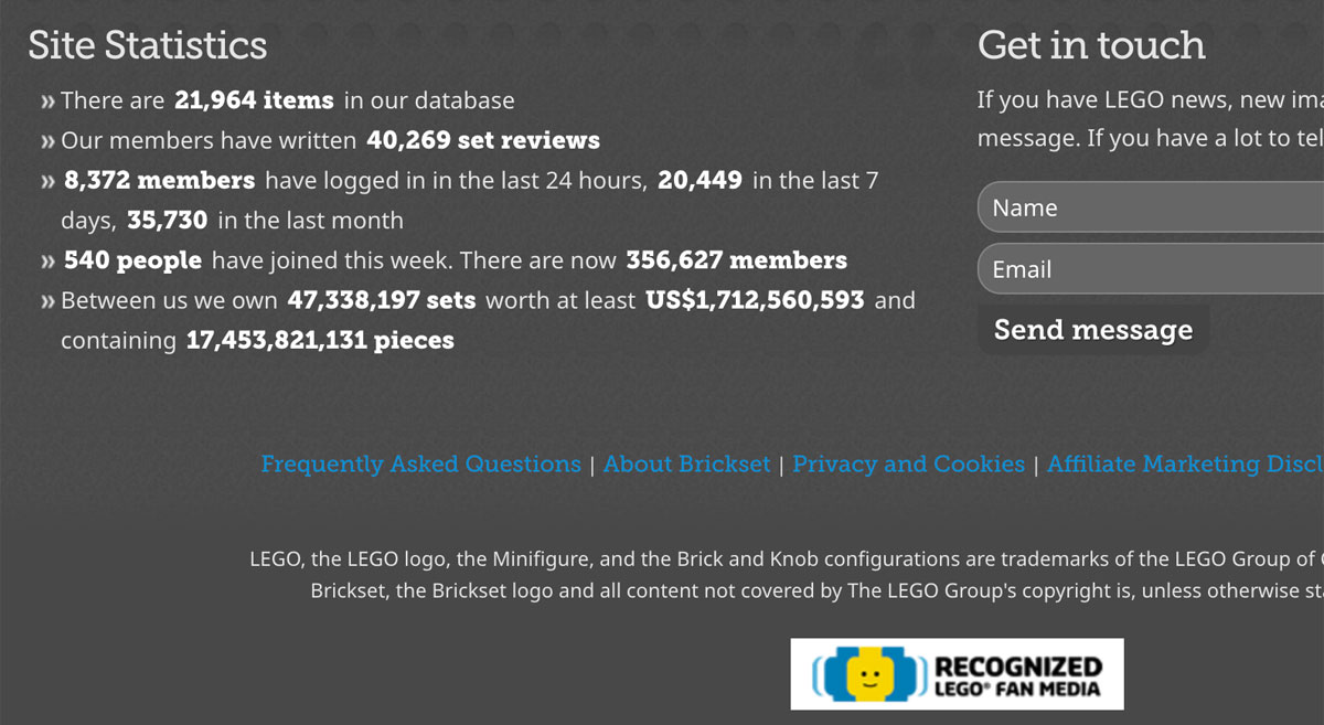 Interessant: Laut Blog-Beitrag zum Jubiläum hat Brickset mehr als 355.000 angemeldete Nutzer, die die Seite mit ihrem Feedback und Input zu dem machen, was sie heute ist. Auch die anderen Zahlen in der Seiten-Statistik sind beachtlich. Demnach sind hier seit Beginn mittlerweile über 40.000 Set-Bewertungen erfolgt und über 21.000 LEGO Produkte von Bau-Set bis GWP und LEGO Tin-Box in der Datenbank zu finden.