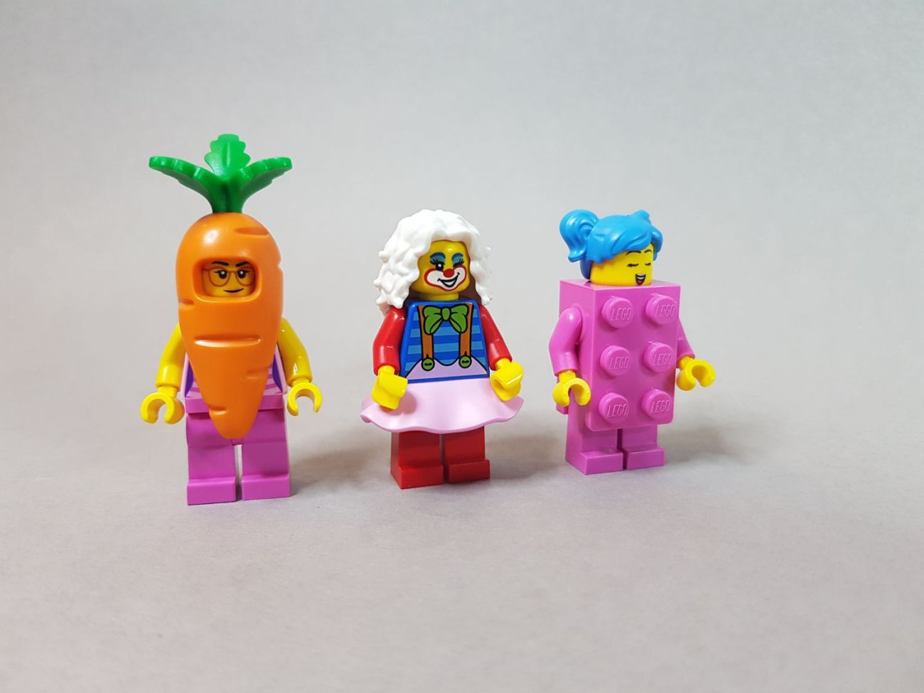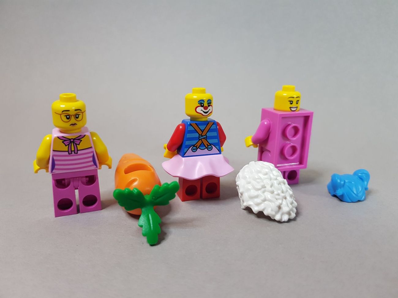 Die anderen drei Figuren könnte man vielleicht auch als Valentinstagsfiguren interpretieren. Die pinken Outfits und der pinke Stein könnten dazu jedenfalls passen. Könnte man auch das Herz mit dem Hund zum Valentinstag zählen? Der pinke Stein passt auf jeden Fall super zur Sammlung der anderen Brickkostüme. Die Karrotte gab es erst vor kurzem in der Sammelfigurenserie 24, den dazu passenden Schmetterling sogar in der aktuellen Serie 25 bei dem Pilzmädchen. Es sind auf jeden Fall schöne Teile und dazu kommen ein paar nette Gesichter. Auch der Clown ist ganz lustig, obwohl es in den Jahren schon ein paar Clowns gab.