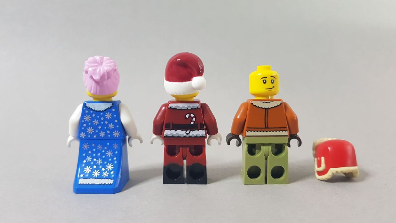 Bei den drei neuen Figuren bekommen wir einen dunkelroten Weihnachtsmann mit Teddybär, eine Frau im Schneeflocken-Kleid mit Schneeflocke und einen Mann mit Winterjacke und Schaufel.