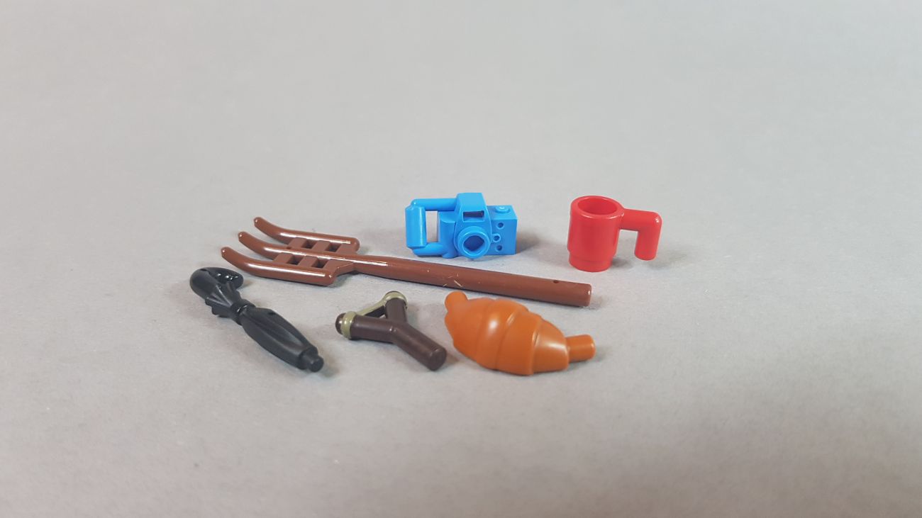 Bei den Minifiguren haben wir viele Standardteile für klassische Minifiguren. Auffällig ist da noch der Meerjungfrau-Schwanz in der Mitte mit einem Jeans-Druck. Ansonsten sind die Hosen relativ uninteressant. Aber bei den Haaren gibt es kleine Highlights wie den Eichelhut aus der Minifigurenserie 22 oder die goldene Mähne von Hagrid von Harry Potter. Bei den Accessoires gab es nur ein besonders interessantes Teil, und zwar die Steinschleuder. Diese gab es auch in der Minifigurenserie 24 beim Zeitungsboten.