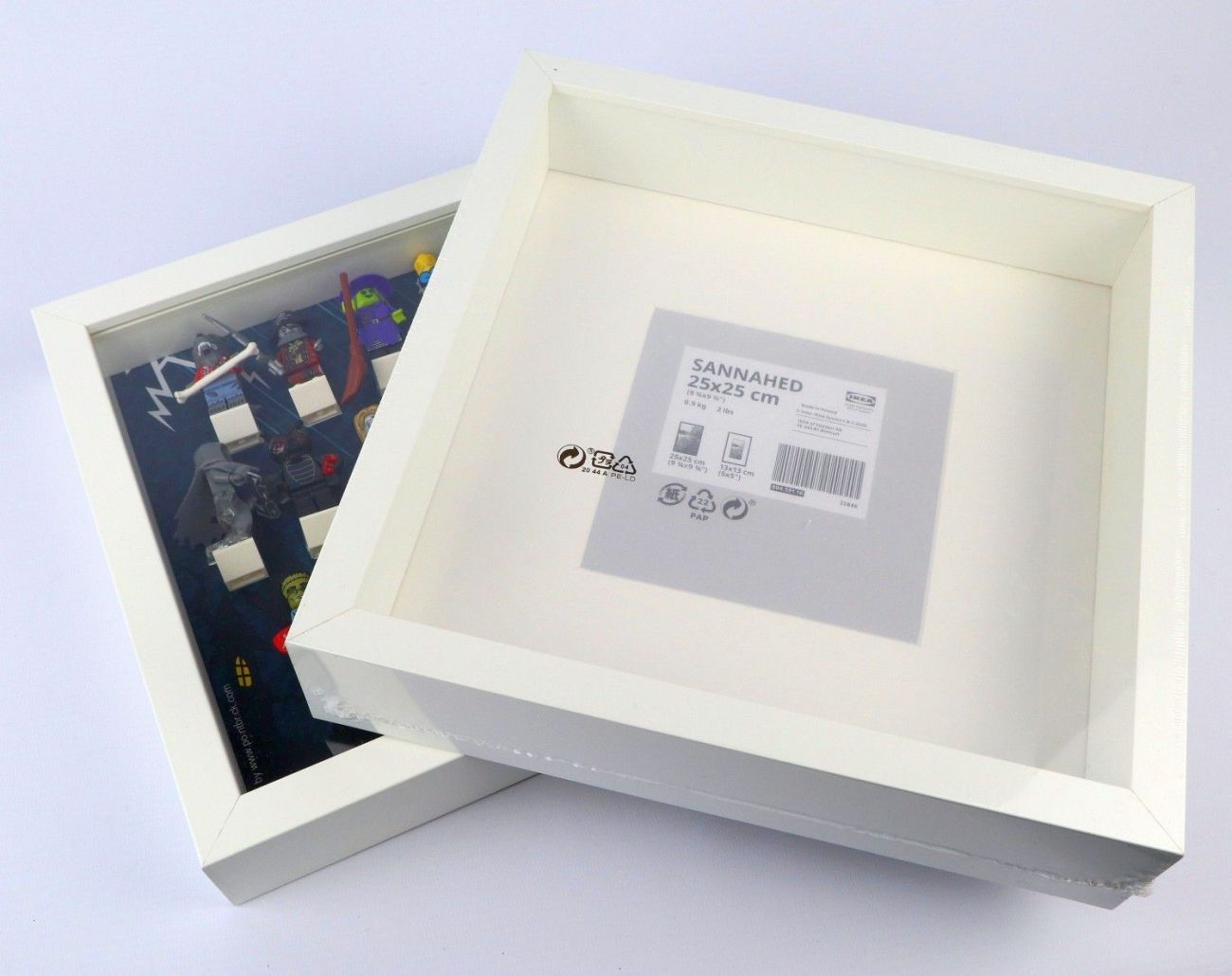 Mit den neuen IKEA Rahmen passen vor allem ältere Minifigurenserien besser in den Rahmen, weil dieser fast zwei Zentimeter größer ist. Während es bei den Ribba Rahmen eine Außengröße von 25 x 25 cm gab, sind die Sannahed bei 27 x 27 cm. Doch auch die Tiefe hat sich verändert. Mit jetzt 6 cm Rahmentiefe passen auch größere Minifiguren besser hinter die Plastikscheibe.