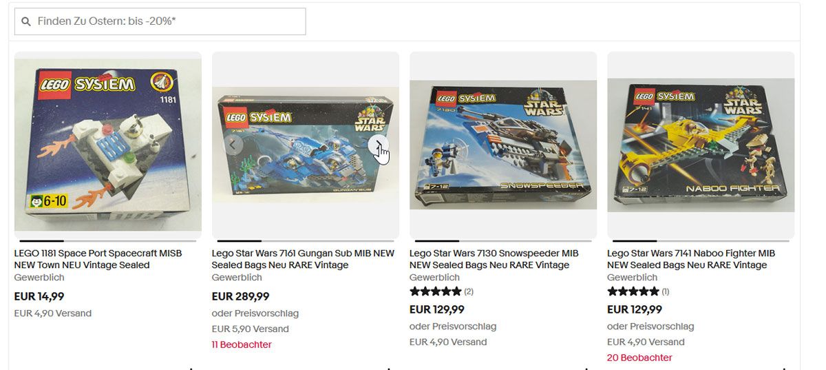 Von LEGO Botanicals über LEGO Star Wars bis hin zu LEGO Zügen und Modular-Häusern – Bei der neuen eBay Gutschein-Aktion sind über 4.000 Produkte dabei. Mein Tipp: Geht auf die Aktionsseite, wählt die Kategorie Spielzeug und geht dann auf Herstellungsjahr (geht bei mir bis 1994 zurück). Belville und Modell Team Sets werden hier angeboten, aber auch LEGO Sets aus der Adventurer Themenwelt oder LEGO System.
