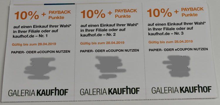 Galeria Karstadt Kaufhof: 3x 10 Prozent Rabatt plus Payback-PunkteGaleria Karstadt Kaufhof: 3x 10 Prozent Rabatt plus Payback-PunkteEingelöst werden können die drei Coupons vor Ort in den teilnehmenden Filialen oder über die Webseite kaufhof.de. Ausgenommen sind wie üblich Geschenkgutscheine, Tabak usw. Gültig sind die Rabatt-Gutscheine bis zum 28. April 2019.