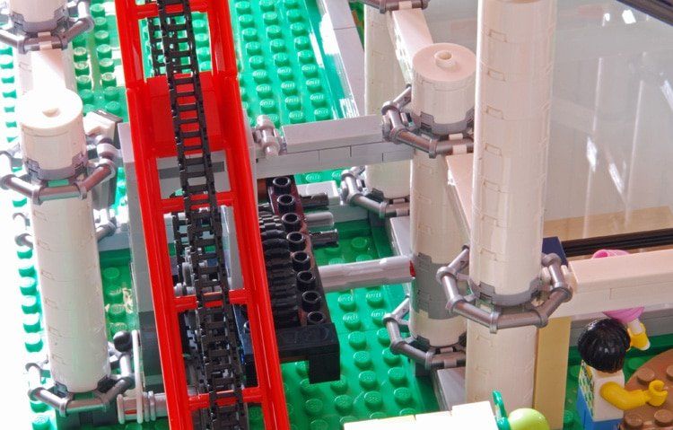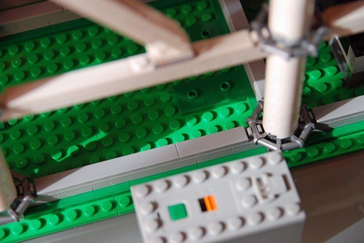 Natürlich lässt sich die Bahn auch nicht leicht drehen, aber dann hätte ich mir schon gewünscht, dass die Integration des Motors so gemacht wird, dass es nicht enttäuscht. Außerdem dreht sich vorne die Kurbel wild mit, das sieht unschön aus. Natürlich könnt ihr das alles selbst ändern und verbessern, aber bei einem solchen Set erwarte ich eigentlich eine perfekte Lösung „ab Werk“.