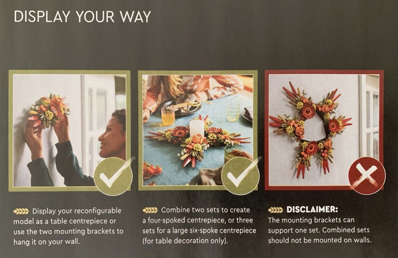 Wer sich bereits die Verpackung des Sets etwas genauer anschaut, wird hier schon zwei Besonderheiten feststellen. Als Erstes kann man auf der Vorderseite der Verpackung ein Logo finden, welches die Anzahl der „Erbauer“ mit 1-2 kennzeichnet. Somit ist dieses Set extra dafür gedacht, nicht allein aufgebaut zu werden. Jedoch sollte es aber auch für einen Einzelnen nicht unbedingt schwerer sein. Auf der Rückseite der Box wird auch gleich darauf hingewiesen, dass man sich gern auch mehrere Sets der Trockenblumen kaufen kann. Diesen können zu einem größeren Gesteck zusammengebaut werden.