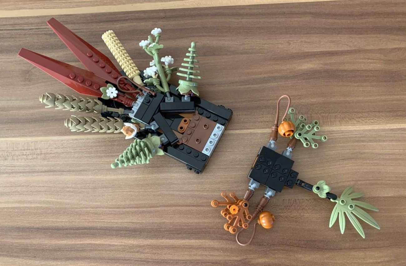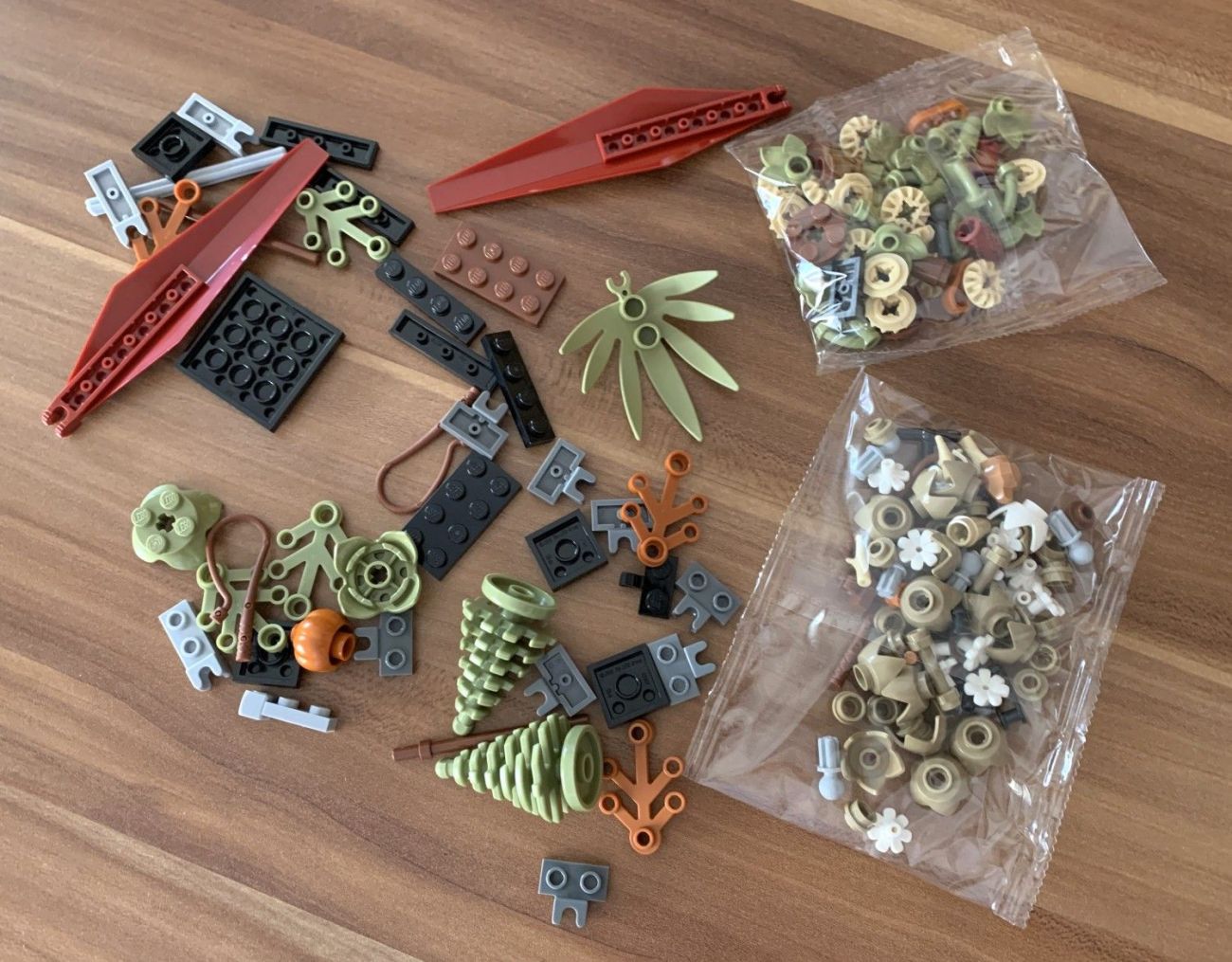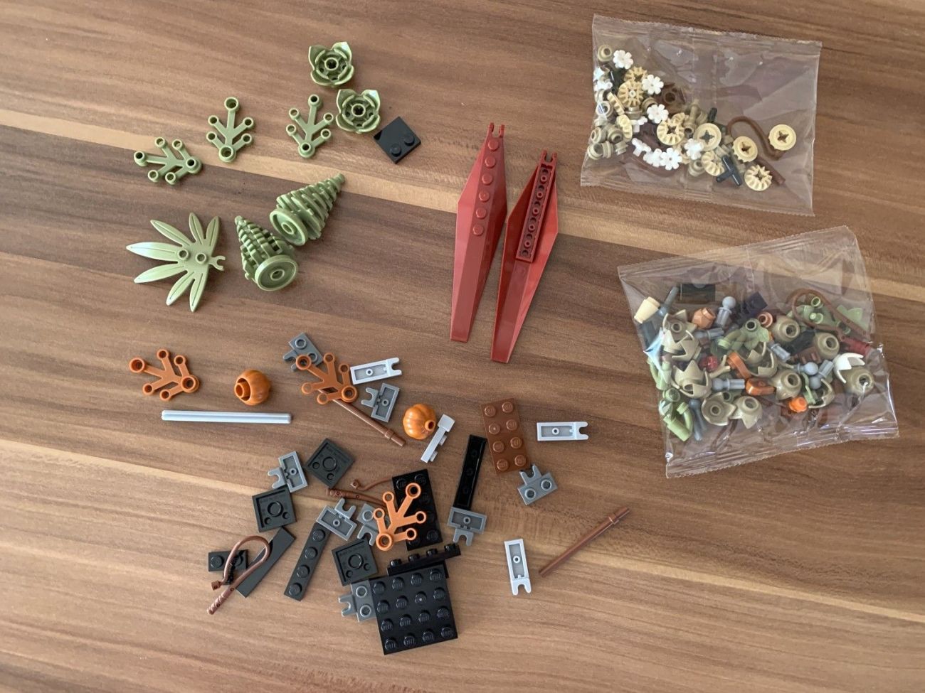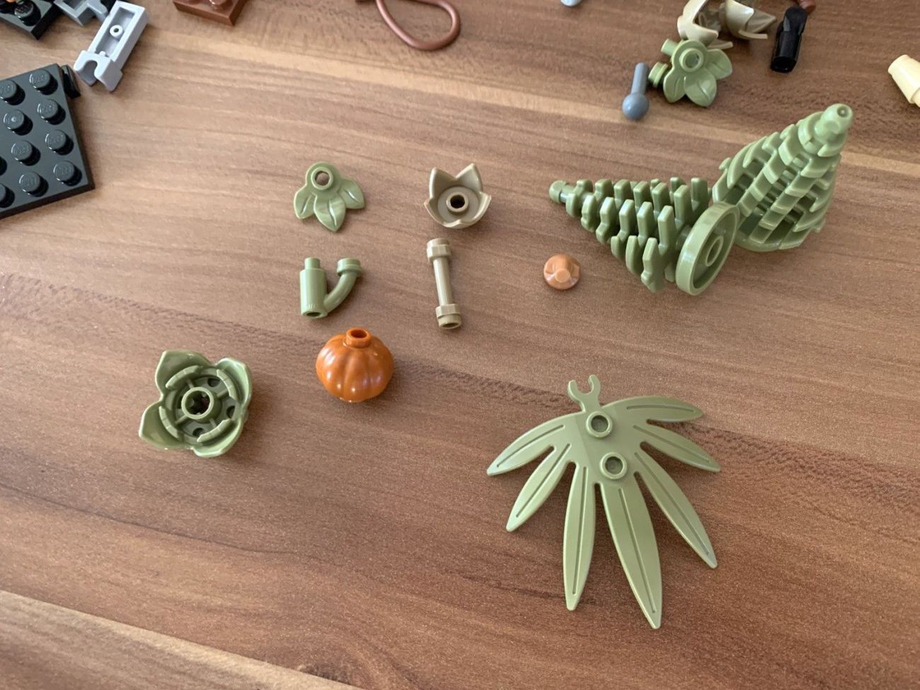 Mit der nächsten Baugruppe können dann endlich die ersten getrockneten Blumen gebaut werden. Dabei fallen gleich die vielen Teile in neuer Farbe auf. Vor allem in der Farbe Olivgrün gibt es nun ein paar mehr Teile. Während es die kleinen Blätter erstmals im Set 76217 Ich bin Groot gab und die Palmenblätter bereits 2017 im LEGO Star Wars 75171 Battle on Scariff vorkamen, sind der Tannenbaum und auch weitere Teile erstmals in diesem Set in Olivgrün enthalten.