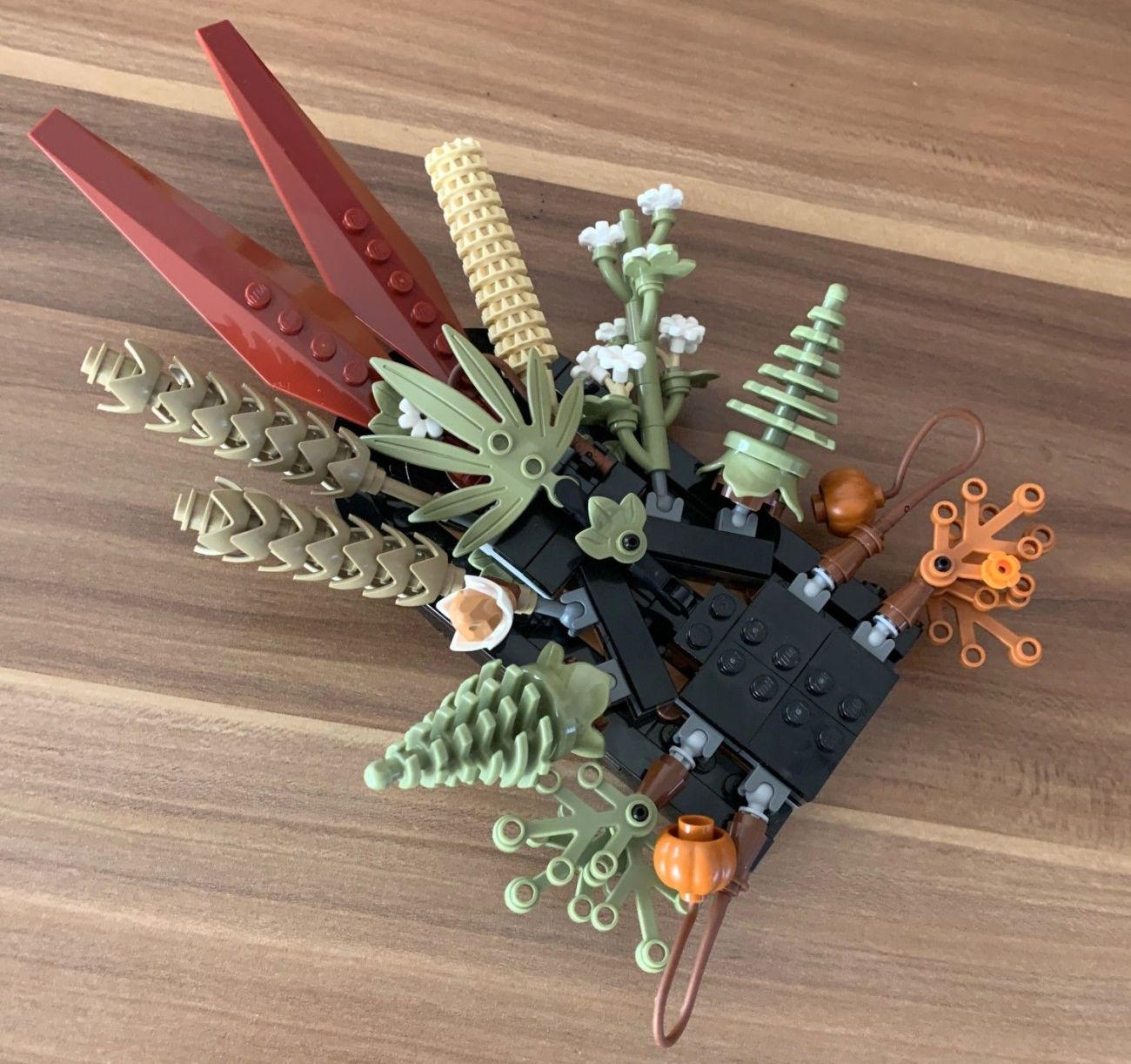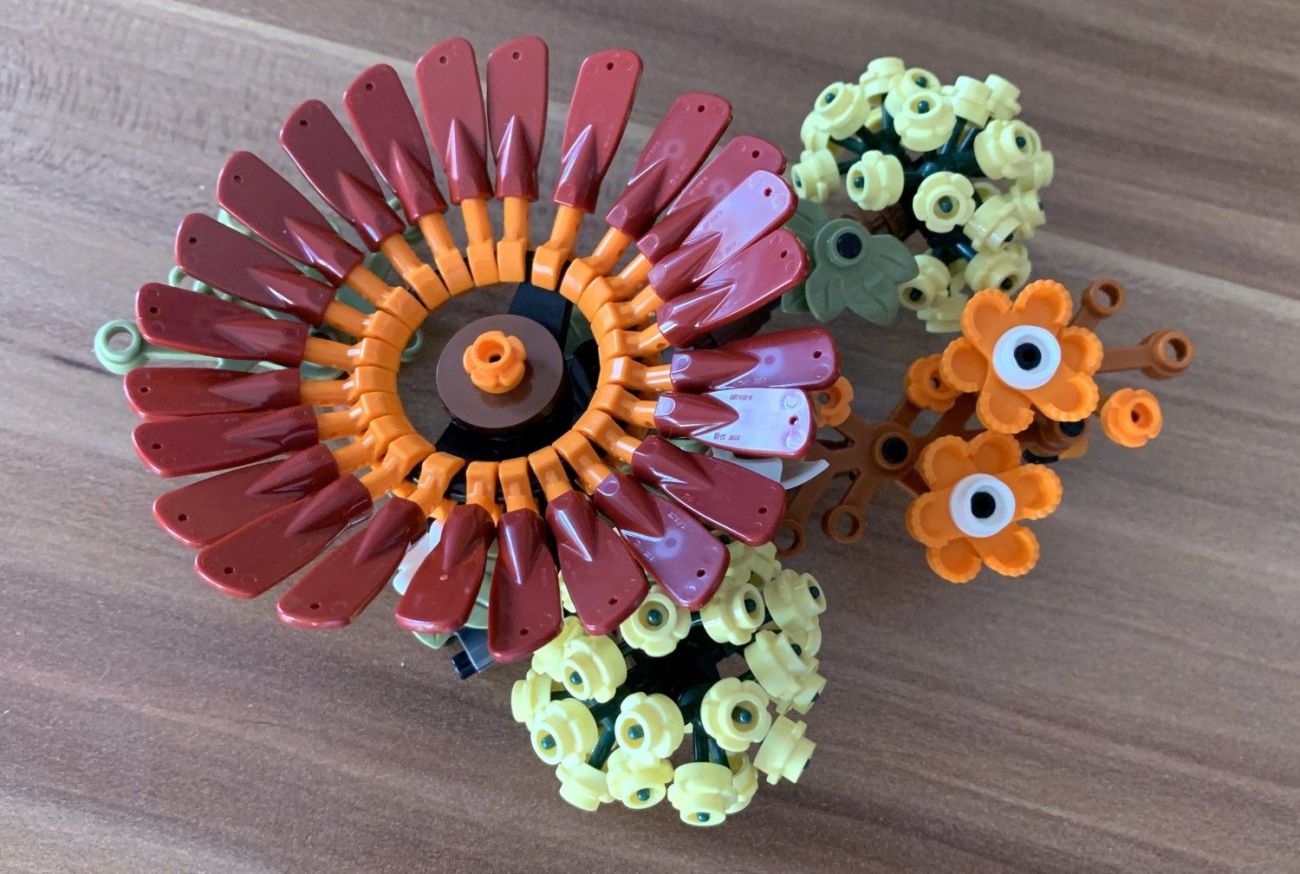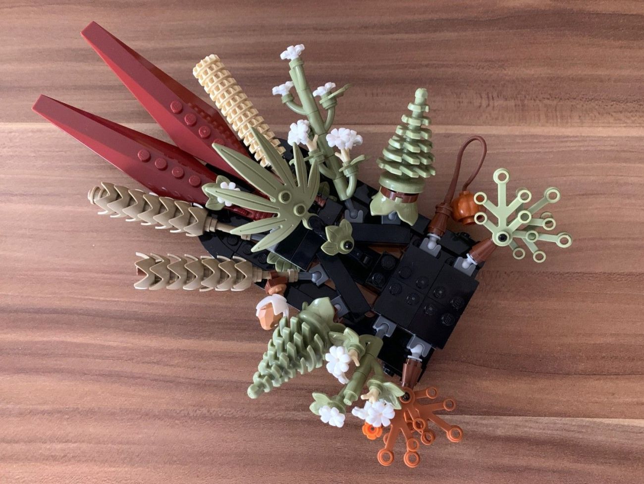 Es werden dann noch viele weitere kleine LEGO Elemente zu diversen Blumen und Blüten verbaut, sodass am Ende die Gesteckplatte vollständig mit Trockenblumen bedeckt ist.