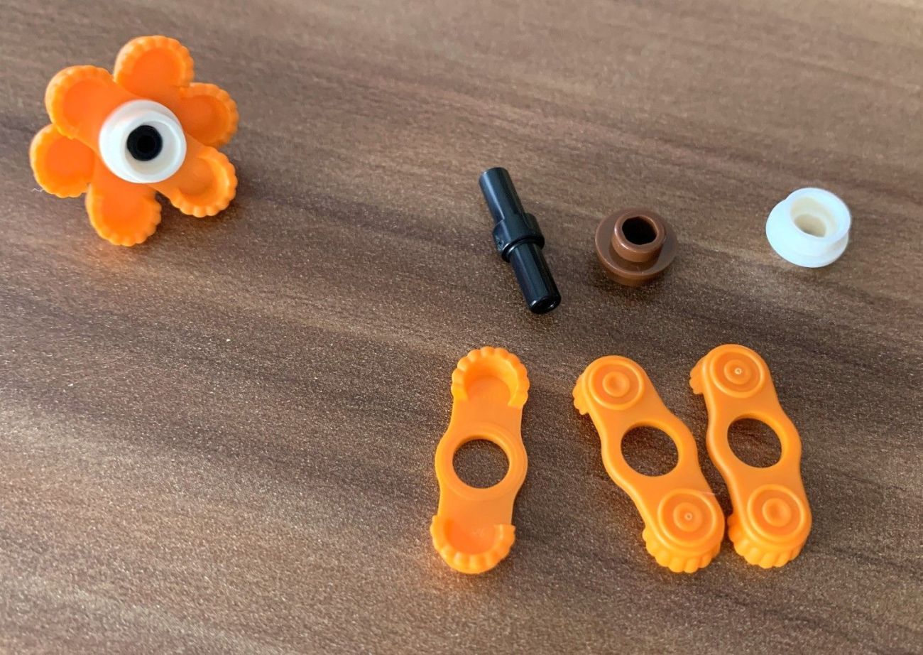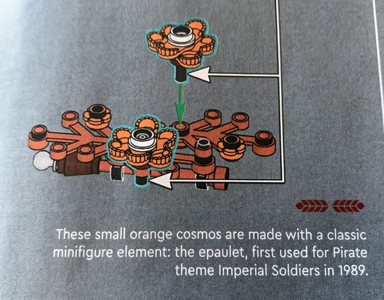 Wer sich die entsprechenden Einzelteile der Tüte Nummer 3 des LEGO 10314 Trockenblumengestecks genauer anschaut, wird seinen Augen kaum trauen. Was findet man denn hier wieder? Es sind Epaulette/Schulterklappen, welche bisher nur als Minifiguren-Zubehör bekannt waren. Zumeist kamen diese in den vielen Piratensets vor, welche die Dänen vor einigen Jahrzehnten produziert haben. Wer sich nun das besondere Teil einmal bei Bricklink anschaut, wird feststellen, dass dies bisher noch nicht in der Farbe Orange vorhanden war.