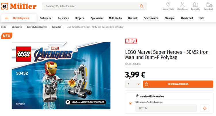 Nach den neuen LEGO Star Wars Polybags gibt es bei Müller jetzt auch das von vielen Fans und Sammlern heiß erwartete LEGO Marvel Avengers Iron Man und Dum-E (30452) Polybag zu kaufen. Der Preis liegt bei 3,99 Euro, pro Kunde können maximal zehn Polybags in eine Müller Filiale zur Abholung bestellt werden.