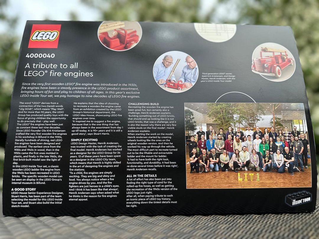 Die 4000040 LEGO Fire Engine ist wie immer streng limitiert. Bis zum November finden insgesamt sechs LEGO Inside Touren statt. Jede der sechs Set-Chargen, die sich einzig durch das Teilnehmerfoto auf der Rückseite unterscheiden, ist auf 60 Exemplare limitiert. Der Wert eines solchen Sets lässt sich wie immer schwer bestimmen, denn für so gut wie alle Teilnehmer der Tour dürfte ihr persönliches Exemplar, das auch immer ein Foto der Teilnehmer auf der Rückseite enthält, unverkäuflich sein.