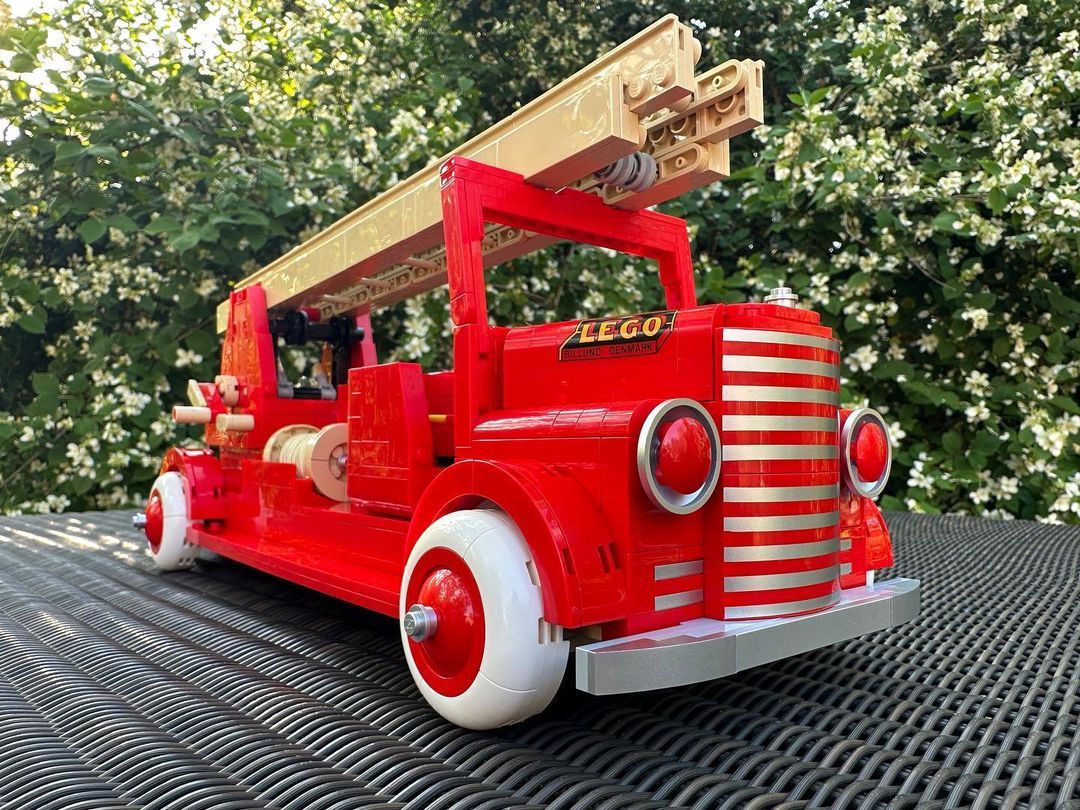 Die 4000040 LEGO Fire Engine stellt einen Nachbau eines klassischen LEGO Holzspielzeugs dar und wurde von LEGO Design Master Hendrik Andersen entworfen. Sowohl bei der Front des Wagens als auch den seitlich angebrachten LEGO Logos im Stile der 1940er Jahre handelt es sich um bedruckte Teile.