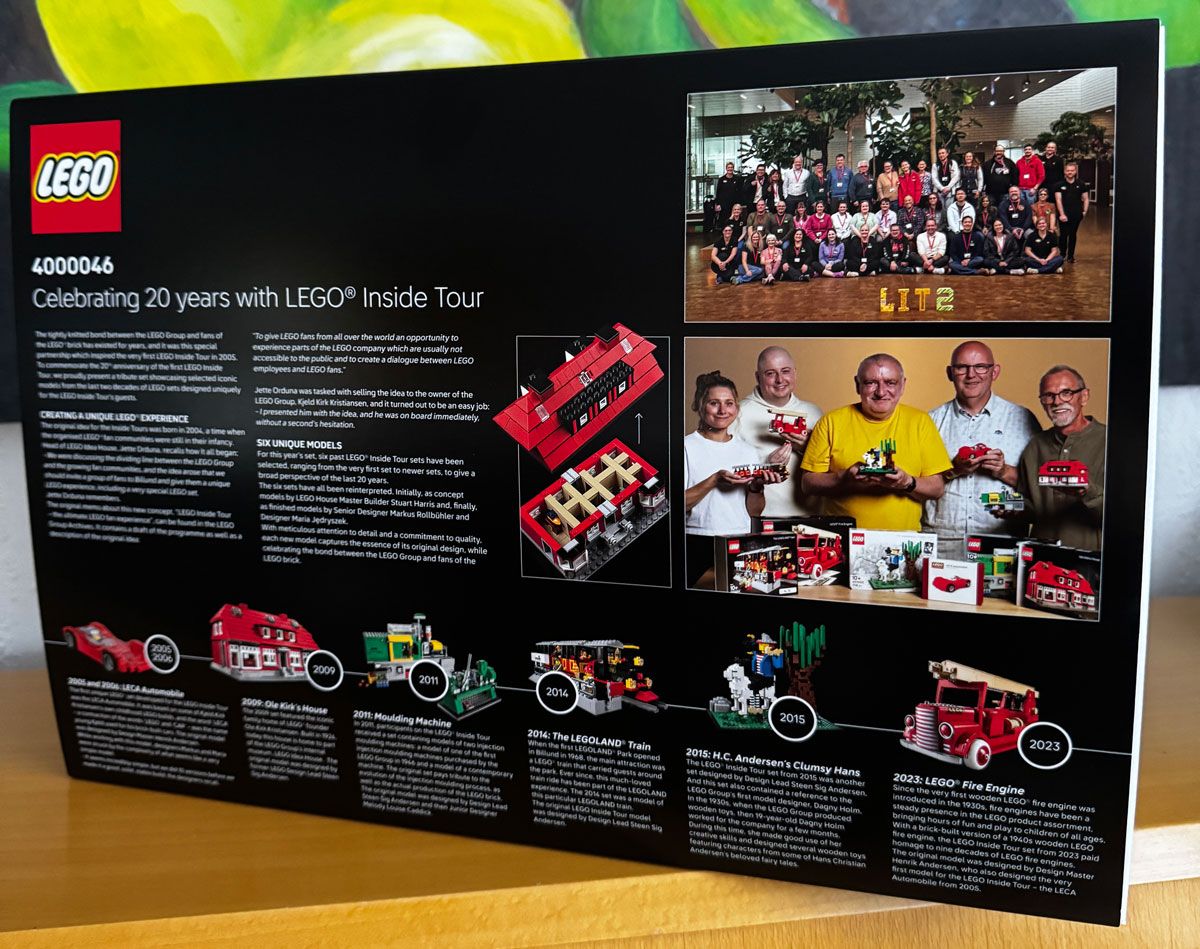 So ist es keine Überraschung, dass wir auf der Verpackung den entsprechenden Aufdruck zum Jubiläum finden. Das Set selbst trägt die Nummer 4000046 und beinhaltet 1.912 Teile, darunter auch einige exklusive Teile. Das Set besteht aus sechs Miniaturmodellen und ist quasi eine kleine „Best-of Sammlung“ aus 20 Jahren LEGO Inside Touren.