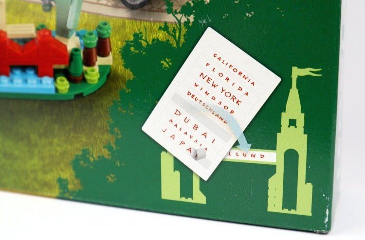 Auf der Vorderseite der Verpackung ist ein typisches LEGOLAND abgebildet. Jeder, der bereits in einem dieser Freitzeitparks gewesen ist, sollte die ein oder andere Attraktion wieder erkennen. Welche es genau sind – dazu kommen wir später. Dabei fällt auf, dass im Eingangsbereich des abgebildeten LEGOLAND Parks „Billund“ zu lesen ist. Damit dieses Set jedoch auch zu einem anderen LEGOLAND Park werden kann – wie Deutschland, New York oder Dubai – liegt diesem Set ein Stickerbogen mit allen weltweiten Namen der LEGOLAND Parks bei. Darauf wird zusätzlich auf der Vorderseite (unten rechts) hingewiesen.