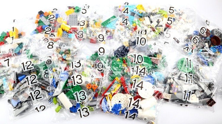 Nach genauem Nachzählen konnte ich der Verpackung fünfzehn Tüten entnehmen – davon sind vierzehn durchnummeriert und in der letzten Tüte sind die Schienenteile für die Drachenachterbahn enthalten. Ansonsten fällt beim genauen Betrachten der Tüten auf, dass diese jeweils mit vielen verschieden und knallbunten LEGO-Steinen gefüllt sind.