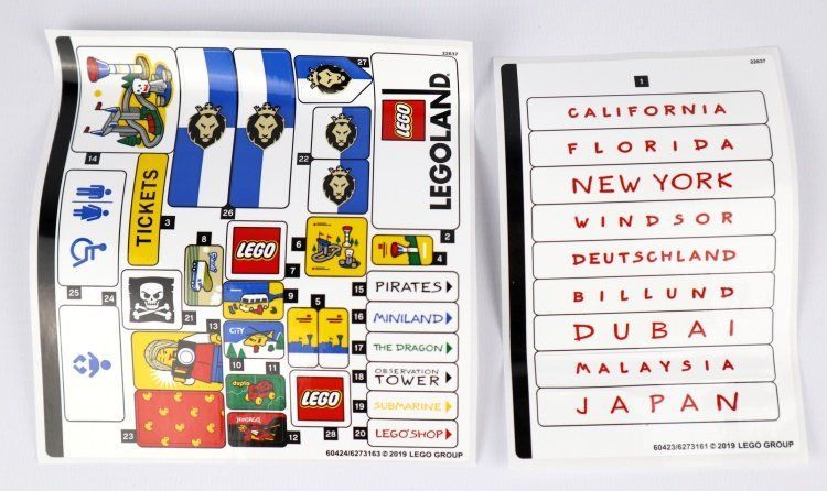 Wie bereits oben erwähnt ist ein Stickerbogen mit allen neun Namen der weltweiten LEGOLAND Varianten enthalten. Zusätzlich gibt es einen weiteren Stickerbogen mit 26 verschiedenen Aufklebern.