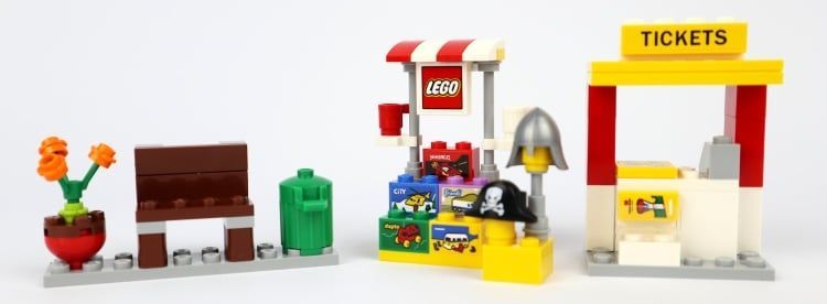 Genau das, was jeder LEGOLAND Besucher schon vollzogen hat, wird in der ersten Bauphase zusammengesteckt. Es gibt einen kleinen Ticketschalter, eine Bank zum Ausruhen, falls der Andrang am Eingang doch etwas höher sein sollte, den Eingang selbst mit den typischen LEGOLAND Türmen und bunten LEGO Steinen und einen kleinen Shop, der sich dann hinter dem Eingang befinden kann. Hierbei werden gleich die ersten drei Tüten mit Einzelteilen benutzt.