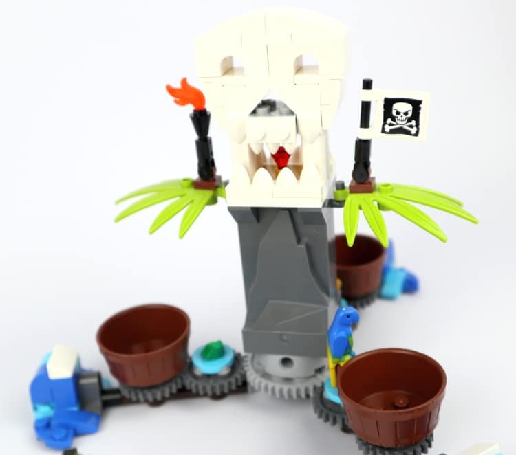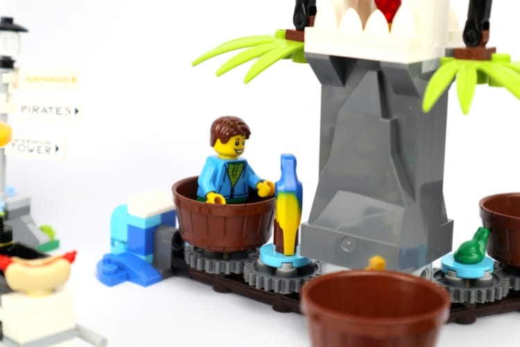 Was jedoch in einem LEGOLAND nicht fehlen darf, sind die Piraten bzw. die Piraten-Attraktionen. Im LEGOLAND Park Set wird dies durch ein Totenkopf-Karussell dargestellt. Dabei gibt es drei sogenannte Krähennester (bekannt von den vielen Piratenschiffen), in welchen der Besucher Platz findet. Durch Drehen des Totenkopfes bewegen sich dann auch die Krähennester. Bereits dabei sieht man die Liebe zum Detail, egal ob es die Kennzeichnung der Krähennester durch einen Papagei, einen Frosch, einen Goldklumpen oder der geheimnisvolle Diamant im Mund des Totenkopfes ist. Persönlich fehlen mir bei fast jedem Piraten-Thema jedoch die alten Palmenblätter, dies ist jedoch Geschmackssache.