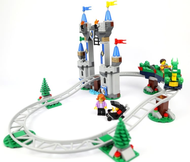 Was in einem Freizeitpark nicht fehlen darf, ist eine Achterbahn für die großen Jungs – auch, wenn es sich hierbei um keine adrenalingeladene Fahrt handeln wird. Action ist mit Sicherheit in der Löwenritterburg mit Drachenachterbahn geboten. Die Designer haben hierbei natürlich die nicht mehr ganz so neuen Schienen verwenden können und dazu auch gleich eine Drachenbahn aus drei Elementen gezaubert. Der Wagen Nummer 1 schmückt sich mit dem Drachenkopf und in den weiteren zwei Wagen können die Besucher Platz nehmen. Die Fahrt ist eine richtige Berg- und Talfahrt, welche allem Anschein nach in der Löwenritterburg beginnt.