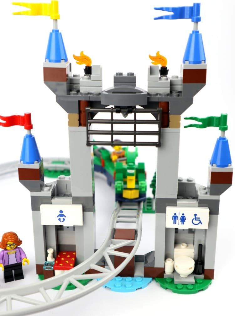 Leider kommt mir hier die Löwenritterburg etwas zu kurz. Diese hat zwar vier Türme mit vier verschiedenen Fahnen, aber man findet nicht einmal einen Eingang oder Start der Achterbahn. Dafür gibt es hinter der Burg doch etwas mehr zu entdecken. Denn auf der Rückseite befindet sich ein WC und die Babywickelstation.