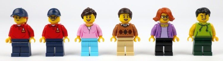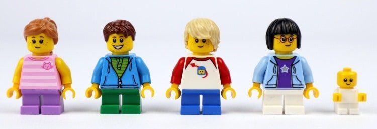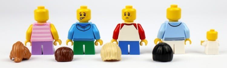 Neben den erwähnten sechs erwachsenen Minifiguren sind noch vier Kinder und ein Baby enthalten. Dabei gibt es vier beidseitig bedruckte Oberkörper und zwei Wechselgesichter. Erfreulich finde ich die Weiterentwicklung der letzten Jahre, dass die Oberkörper fast schon standardmäßig beidseitig bedruckt sind. Nun wird es Zeit auch bei solchen Sets die Bein- oder Armteile zu bedrucken.