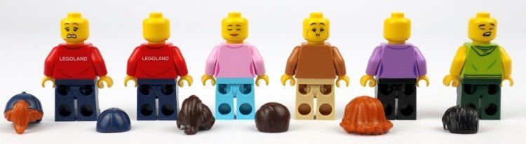 Bevor ich mit dem Aufbau der einzelnen Attraktionen fortfahre, möchte ich schon einmal die Personen vorstellen, die dem LEGOLAND Park am Ende „Leben“ einhauchen. Dazu gehören sechs erwachsene Minifiguren. Fünf davon haben einen beidseitig bedruckten Torso und vier dieser Minifiguren können ein Wechselgesicht vorzeigen. Mir persönlich gefallen die beidseitig bedruckten Oberkörper der LEGOLAND Mitarbeiter am besten. Auch wenn ich nicht alle Minifigurenteile kenne, die jemals erschienen sind, aber diese sind mit Sicherheit „neu“. Sollte ich jemals unserer LEGOLAND Park Set erweitern, dann müssen mehr Mitarbeiter her.