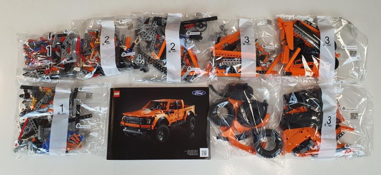 Die Box des LEGO 42126 Ford F-150 Raptor kommt im typischen 18+ Design und misst ca. 48 x 28 x 12 cm. Auf der Vorderseite finden wir neben diversen Logos (Ford, Raptor, Lego, Technic) auch die Setnummer, die Altersangabe und die Teileanzahl (1379 Stück). Auf der Rückseite erwarten uns Bilder und Daten zum originalen Vorbild, allerdings keinerlei Infos zu den Funktionen des LEGO-Modells. Im Inneren des Kartons verbergen sich insgesamt sieben nummerierte und eine unnummerierte Tüte, in denen die Kotflügel und Räder aufbewahrt werden, sowie eine Anleitung und der obligatorische Stickerbogen. Am gesamten Modell gibt es leider nur zwei Prints, und zwar den Raptor-Schriftzug auf den beiden hinteren Kotflügel-Elementen. Ich baue das Modell zuerst ohne Sticker auf und bringe diese erst nachträglich an. Im Review findet Ihr dann einen Vorher-Nachher-Vergleich, mit dem Ihr Euch ein Bild von beiden Varianten machen könnt.
