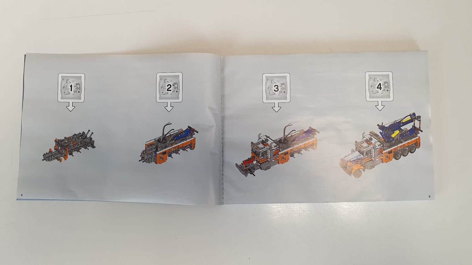 Auf der Rückseite findet man neben Detailbildern zu den einzelnen Funktionen auch eine Größenangabe des Modells, das der Abbildung zufolge eine Länge von 58 cm aufweist. Sind die Siegel einmal durchtrennt, erwarten uns elf nummerierte und nochmal drei unnummerierte Tüten, in denen u.a. die Reifen und die Pneumatik-Schläuche verpackt sind. Insgesamt wird der Abschleppwagen in vier Bauabschnitten zusammengebaut, was auch in der Bauanleitung auf einer Doppelseite gezeigt wird. Der obligatorische Stickerbogen darf natürlich auch nicht fehlen und ist zusammen mit der Anleitung nochmal extra in Plastik eingeschweißt.