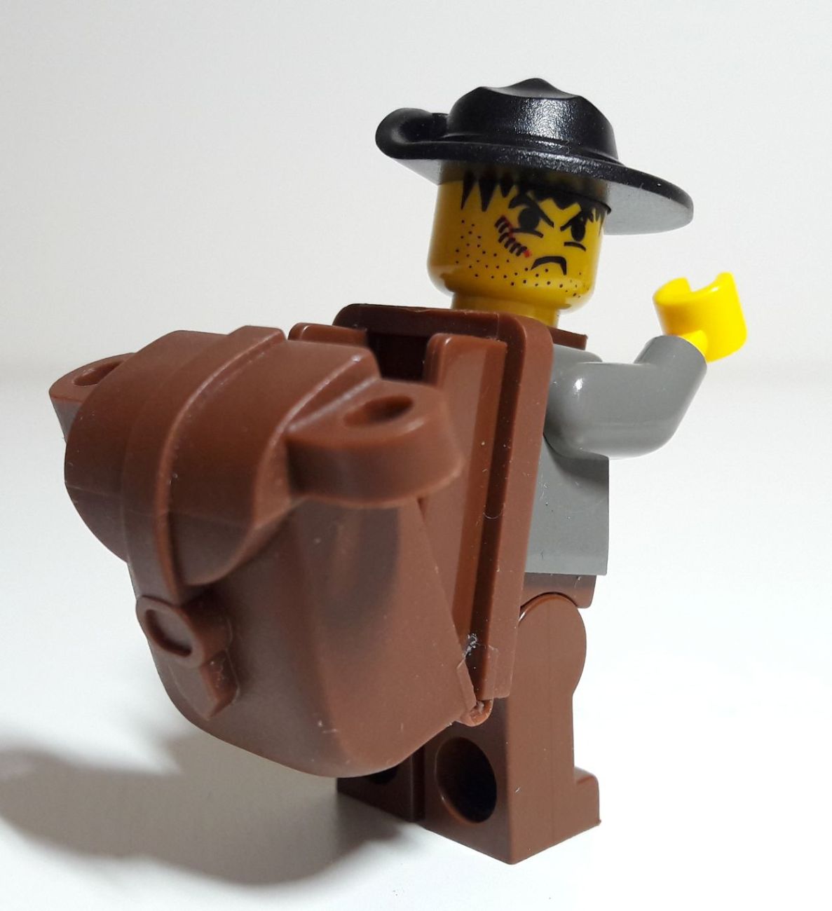 Eine schöne Idee ist auch der Rucksack, den Rudo Villano mit sich trägt und den man öffnen kann. Die Sonnendisk lässt sich zwar nicht hineintun, dafür kann man aber zwei Schwerter an den Seiten befestigen. Mit zwei Ausnahmen wurde dieser Rucksack ausschließlich bei Sets der Adventurers-Serie verwendet, was schade ist, würde sich das Utensil auch bei Stadt- oder City-Sets nicht übel machen.
