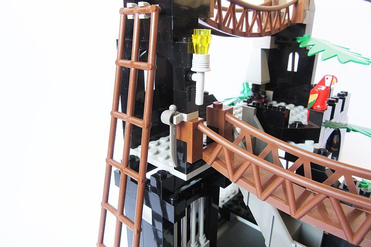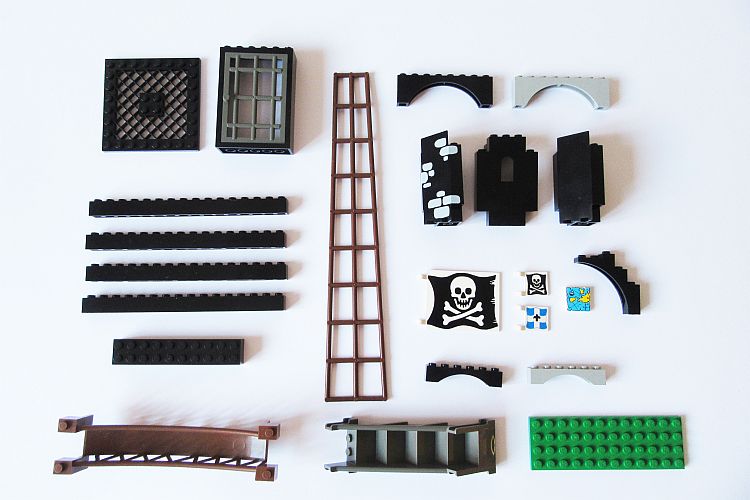 Viele größere Elemente befinden sich unter den insgesamt knapp 380 Teilen des Sets. Darunter natürlich die klassischen Piratenelemente wie Takelage, Fahnen, Gefängnistür, Hängebrücken, aber auch schöne große Steine in 1×16 oder 2×10. Die Mauerelemente waren übrigens alle bedruckt – heute sind es leider nur noch Sticker – warum auch immer.