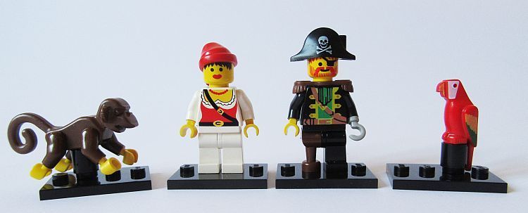 Dem Set wurden insgesamt sieben Minifiguren mitgegeben. Darunter natürlich der Piraten-Kapitän – samt bedrucktem Hut, brauner Epaulette, dem klassischen Torso, sowie Haken und Holzbein. Der klassische Klassiker unter den klassischen Piraten! Ebenso ist eine Piratenbraut enthalten, mit schönem Dekolleté und knallig roten Lippen. Fehlen darf auch nicht ein Papagei und ein cooler Affe.