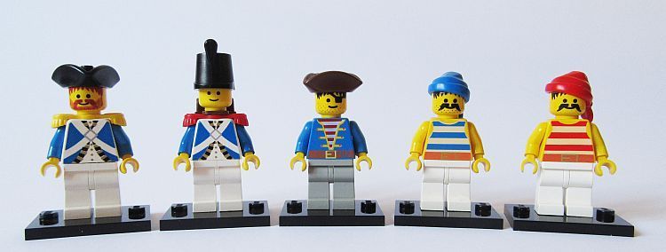 Der Rest der Truppe besteht aus zwei einfachen Piraten mit gestreiften Muskelshirts und Kopftüchern, einem Piraten mit Augenklappe und blauer Jacke sowie einem Jack-Sparrow-Hut und zwei schick uniformierten Blaurocksoldaten, wovon einer wieder den Rucksack tragen darf. Alle Torsos sind im übrigen nur von vorn bedruckt, ebenso gibt es keine Wendegesichter.