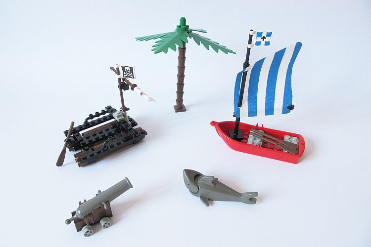 Wie schon erwähnt, fängt man mit dem Zubehör an. Dazu zählt ein Hai, eine Kanone (mit Rückstoß), eine Palme, ein kleines Piraten-Floß und ein Hybrid-Boot aus Segel- und Ruder-Antrieb für die reichen Blaurocksoldaten.