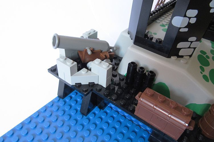 Aber zurück zu dem Piratennest und hinein in die Details. Die kleine blaue Basisplatte bildet eigentlich nur das angrenzende Wasser für den kleinen Steg. Hier befinden sich neben einer Schatztruhe voller Gold, auch ein Fass sowie die inseleigene Kanone plus Munition.