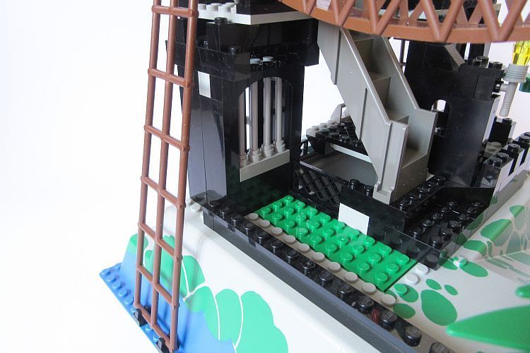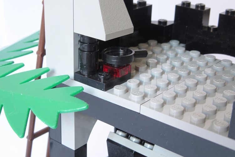 Noch einmal der Blick von oben auf die Insel. Man erkennt auch hier den (sehr) einfachen Kran. Es ist eigentlich nur eine Schnur die durch eine graue lange Technic-Platte ein wenig geschwenkt werden kann. Eine Kurbel zum Heben und Senken fehlt leider, dass muss manuell durch Ziehen an der Schnur erfolgen.