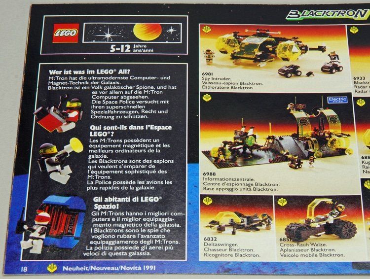 „M:Tron hat die ultramodernste Computer- und Magnet-Technik der Galaxis. Blacktron ist ein Volk galaktischer Spione, und hat es vor allem auf die M:Tron Computer abgesehen. Die Space Police versucht mit superschnellen Spezialfahrzeugen, Recht und Ordnung zu schützen.“