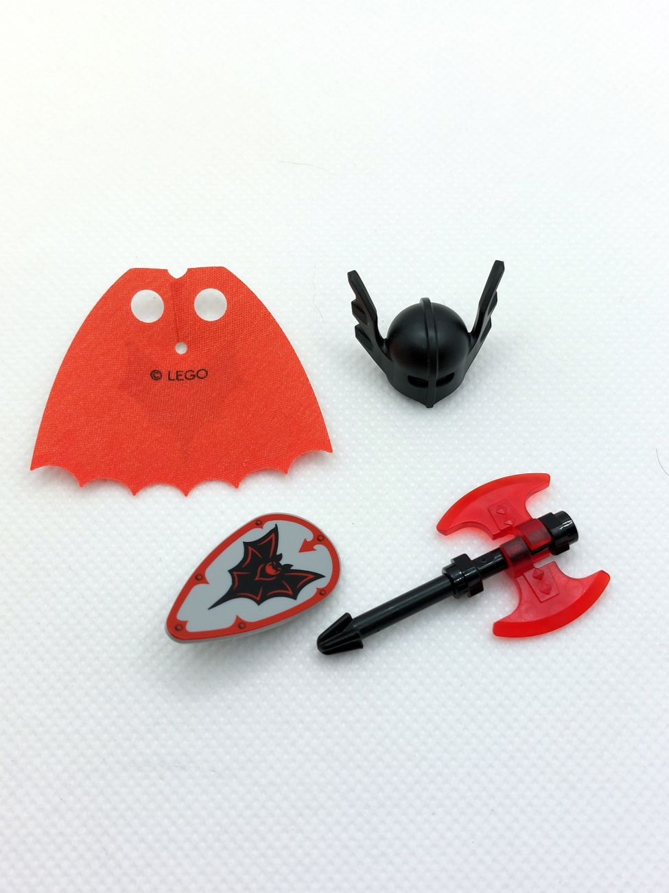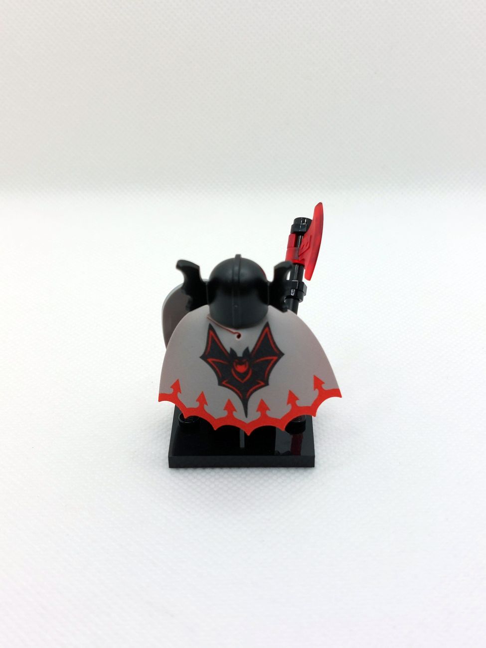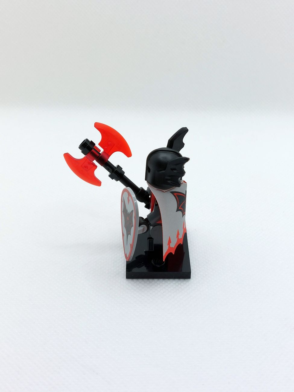 Basil the Batlord liefert uns die Neuauflage der Figur aus den 90ern und die Umsetzung ist grandios! Torso und Beine sind aufwendig bedruckt und sicher vielfältig in Castle-MOCs einsetzbar. Der Kopf hat einen Schnurrbart und Vampirzähne, eine Seite hat rot glühende Augen, was mit der Neuauflage des Fledermaushelmes wirklich bedrohlich aussieht. Das Schild ist mit dem klassischen Fright Knights Logo bedruckt, genau wie der äußerst aufwendige zweiseitige Mantel. Die Axt mit trans-red Beilen rundet das Bild ab.