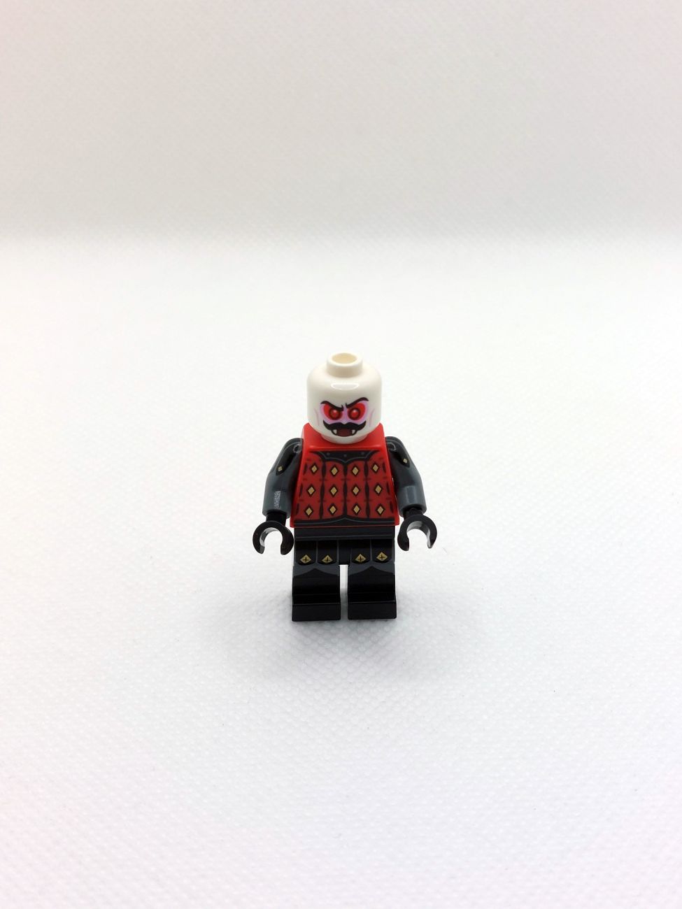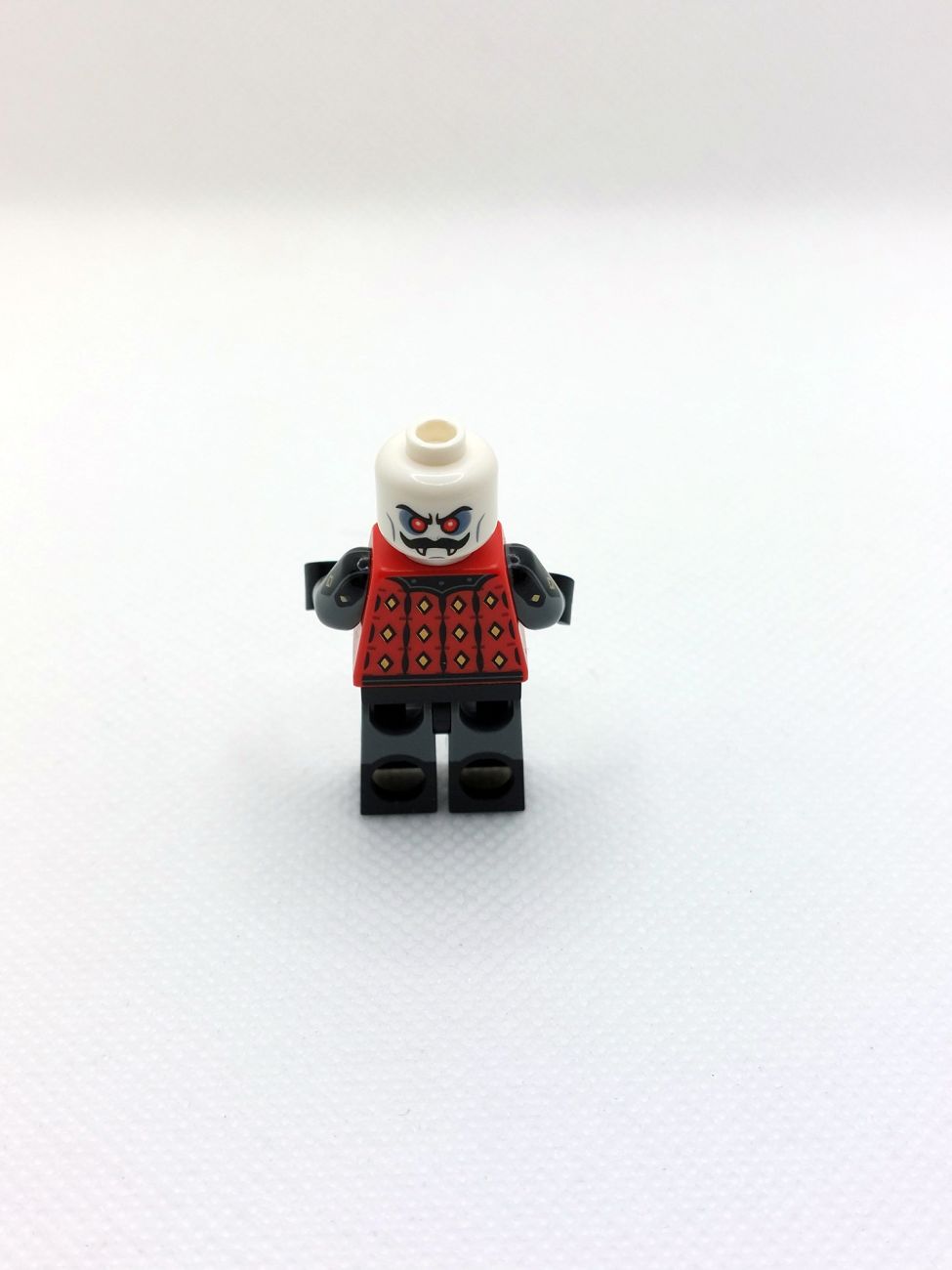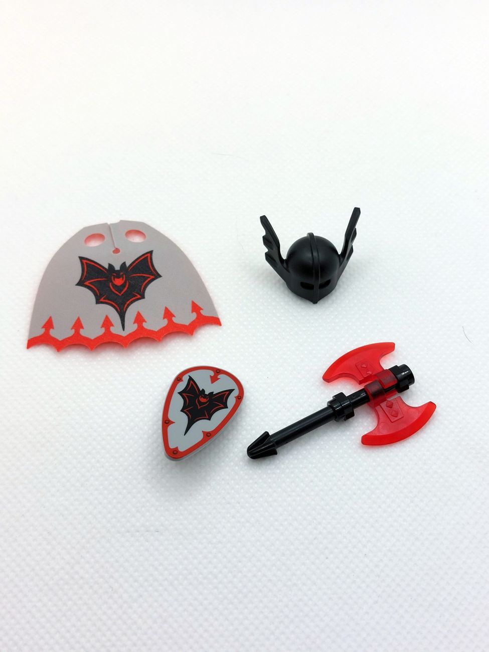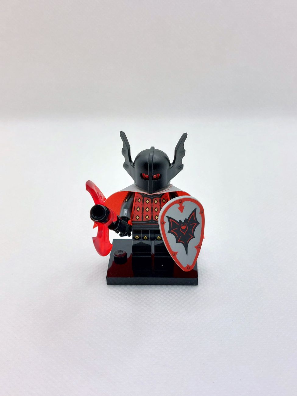 Basil the Batlord liefert uns die Neuauflage der Figur aus den 90ern und die Umsetzung ist grandios! Torso und Beine sind aufwendig bedruckt und sicher vielfältig in Castle-MOCs einsetzbar. Der Kopf hat einen Schnurrbart und Vampirzähne, eine Seite hat rot glühende Augen, was mit der Neuauflage des Fledermaushelmes wirklich bedrohlich aussieht. Das Schild ist mit dem klassischen Fright Knights Logo bedruckt, genau wie der äußerst aufwendige zweiseitige Mantel. Die Axt mit trans-red Beilen rundet das Bild ab.