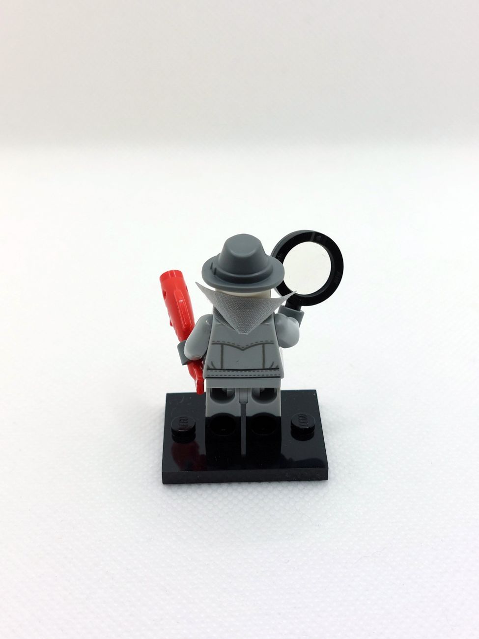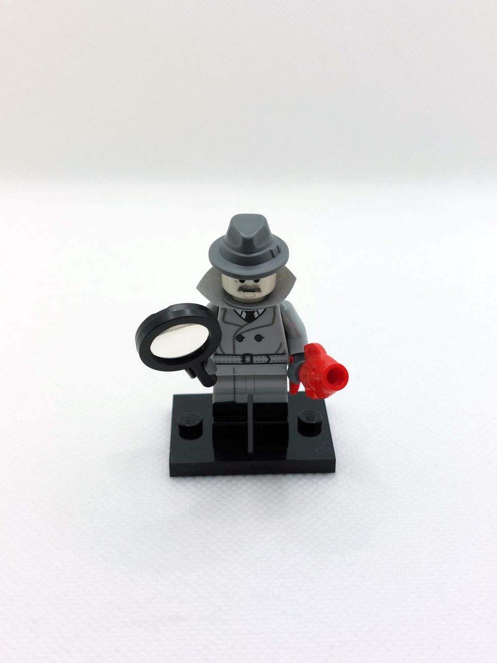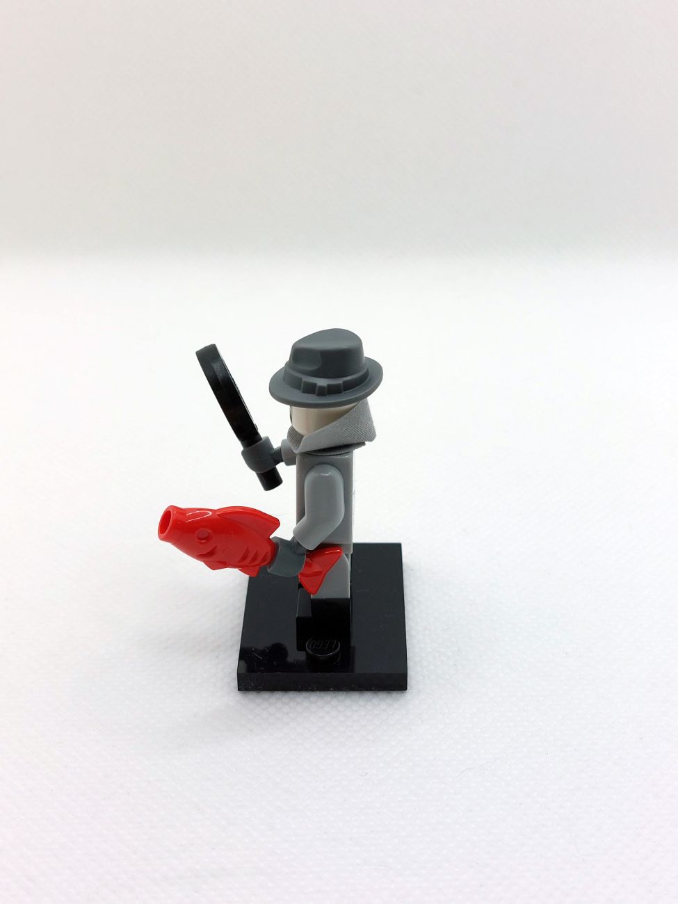 Die erste Figur ist der Noir Detective, angelehnt an klassische schwarz/weiß Krimis. Er kommt mit der Lupe in schwarz und einem roten Fisch, einem sog. „Red Herring“, eine Bezeichnung für eine falsche Fährte in Geschichten oder Filmen. Die recht beliebten dual-mold Beine in hellgrau/schwarz kommen hier mit einem kleinen Print (ohne Print waren sie lediglich bei einer einzigen Figur aus Minifigurenserie 22 dabei), sind aber trotzdem gut kombinierbar mit beispielsweise hellgrauen Star Wars Offizieren.