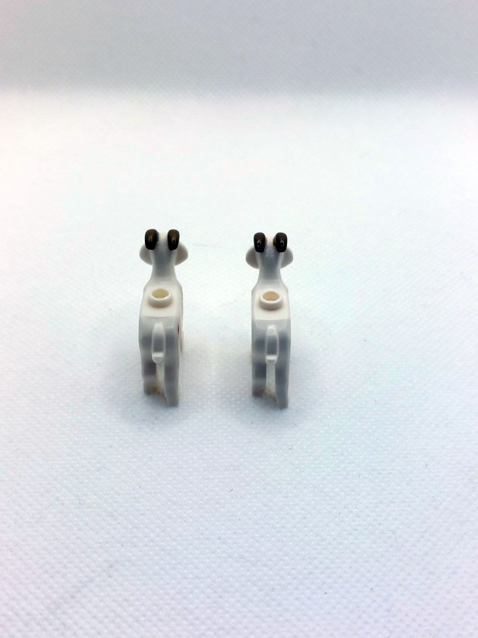 Die Unterseite weist als Einziges überhaupt Unterschiede auf, aber auch bei näherere Betrachtung nicht in der Form an sich. Die neue Ziege hat in der Lücke am „Bauch“ eine andere Anordnung der Teilenummer und des LEGO Logos sowie Angusspunkt, außerdem sind die kleinen runden Punkte auf jeder Pfote deutlicher zu sehen als bei der alten Variante. Das Gewicht unterscheidet sich übrigens merklich, es kann also davon ausgegangen werden dass es sich wirklich um einen neuen Mold handelt, allerdings sind die Außenmaße exakt wie beim alten Guss.