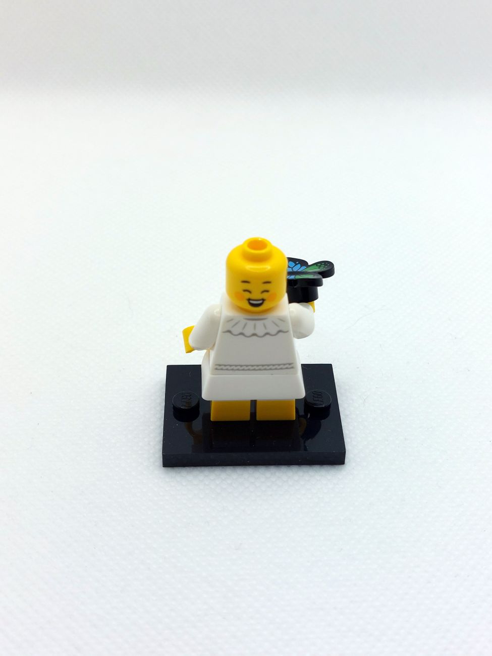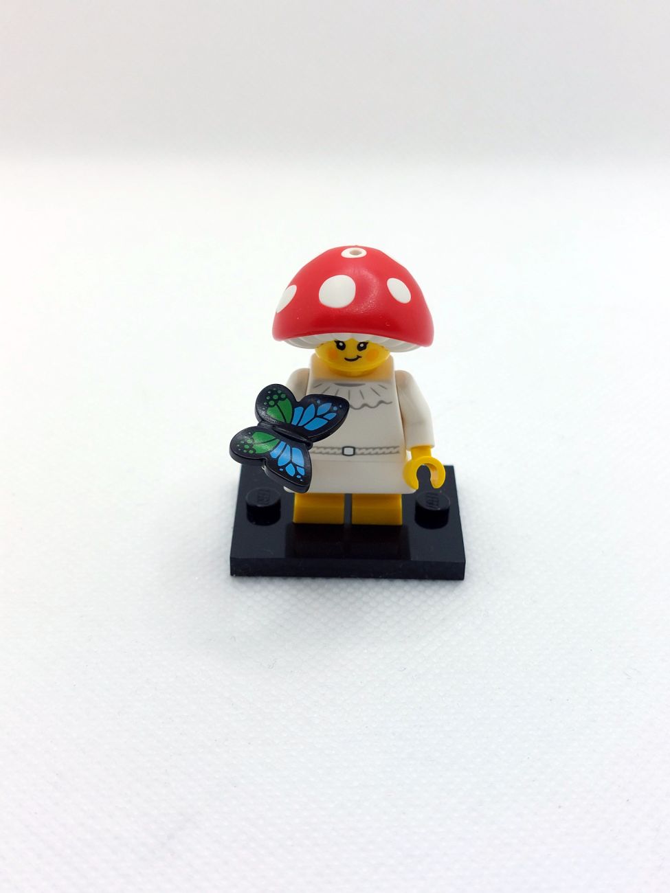 Das Kind mit Pilzkopf kommt mit einem tollen neuen Kopfteil, das sicher auch bei mir in einigen MOCs zur Anwendung kommen wird. Das doch noch recht neue Rock-Teil kommt hier in weiß und der Schmetterling hat einen neuen Druck.