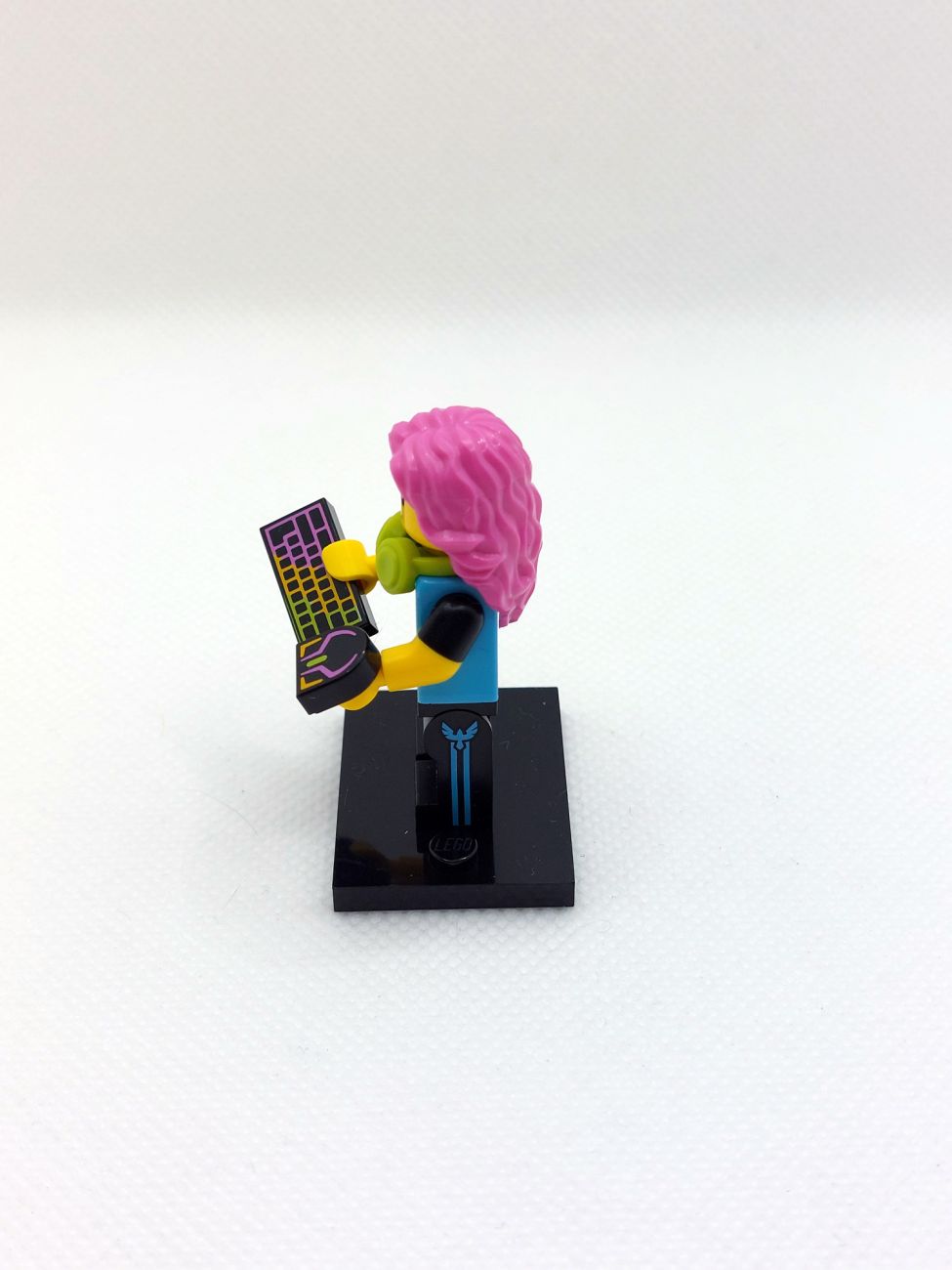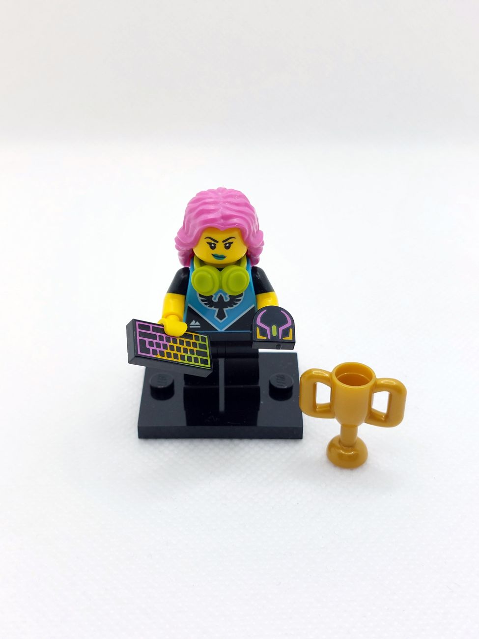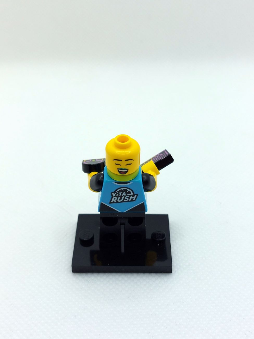 Die E-Sports Gamerin kommt mit Kopfhörern, RGB-Tastatur und Maus, und offensichtlich war sie sehr erfolgreich, da noch ein Pokal beiliegt. Das Team-Logo auf dem Torso und auf dem seitlichen Bein-Print erinnert stark an die Falkenritter. Auf dem Rücken ist ein Werbelogo für das Getränk „Vita Rush“, das uns in diesem Review nocheinmal begegnen wird. Ich persönlich finde solche „LEGO-Eigenmarken“ immer sehr spannend und verwende sie gerne in MOCs (bestes und bekanntestes Beispiel ist natürlich „Octan“).